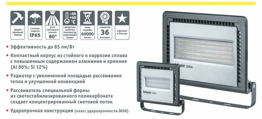 Освещение Navigator 14148 Прожектор LED Navigator предназначен для освещения зданий, сооружений, площадей, парков, скульптур, памятников и других объектов. В качестве источников света используются мощные светодиоды, которые отличаются высоким световым потоком, хорошей цветопередачей и низким потреблением энергии. Имеет компактный корпус из стойкого к коррозии сплава с повышенным содержанием алюминия и кремния. Радиатор с увеличенной площадью рассеивания тепла и улучшенной конвекцией. Рассеиватель специальной формы из светостабилизированного поликарбоната создает концентрированный световой поток.