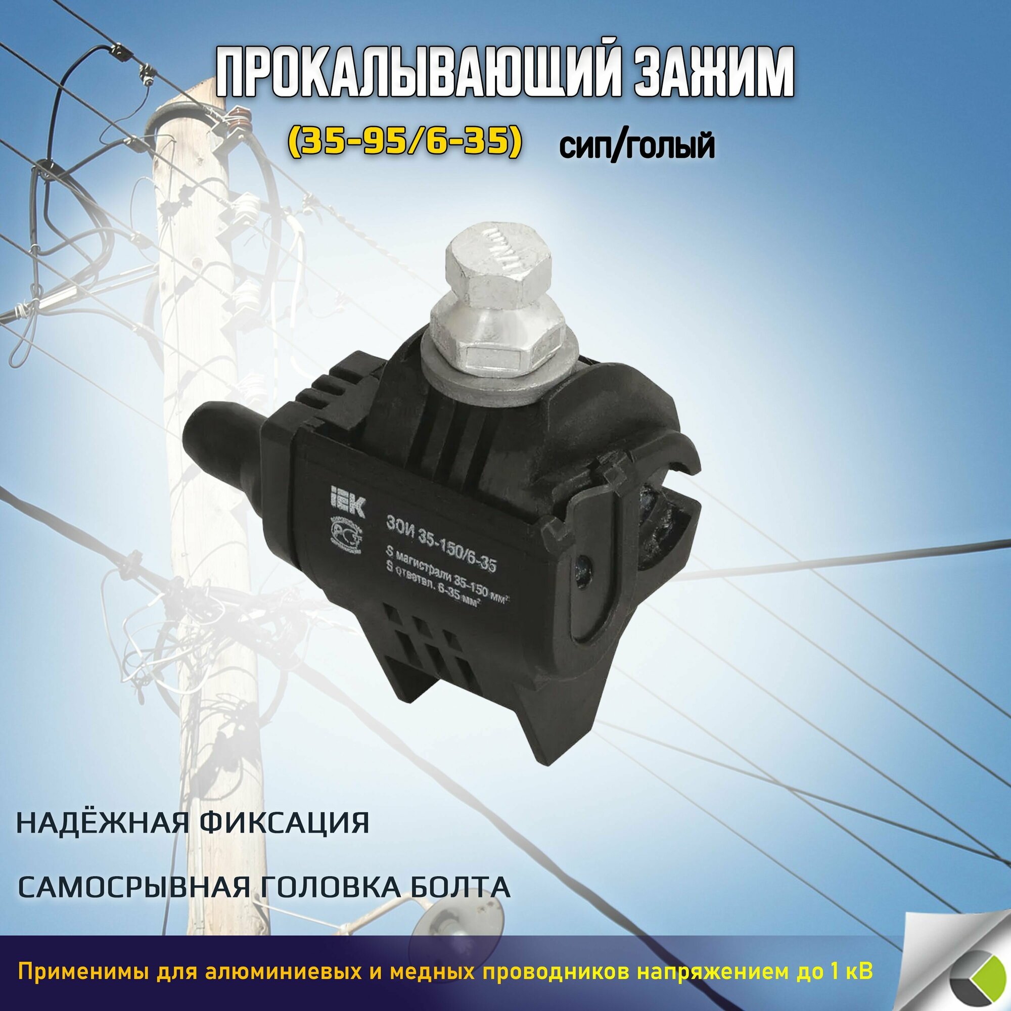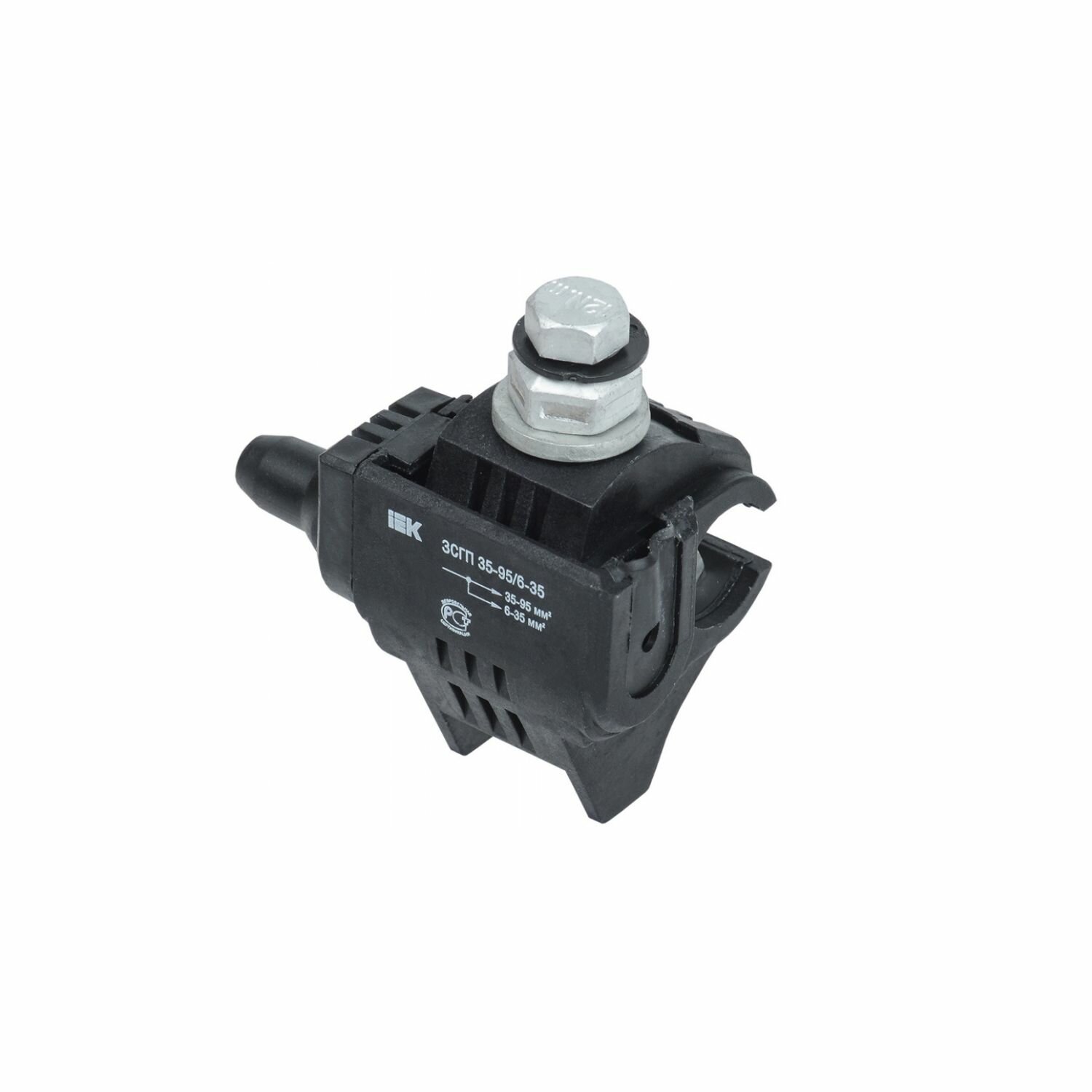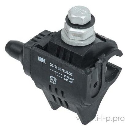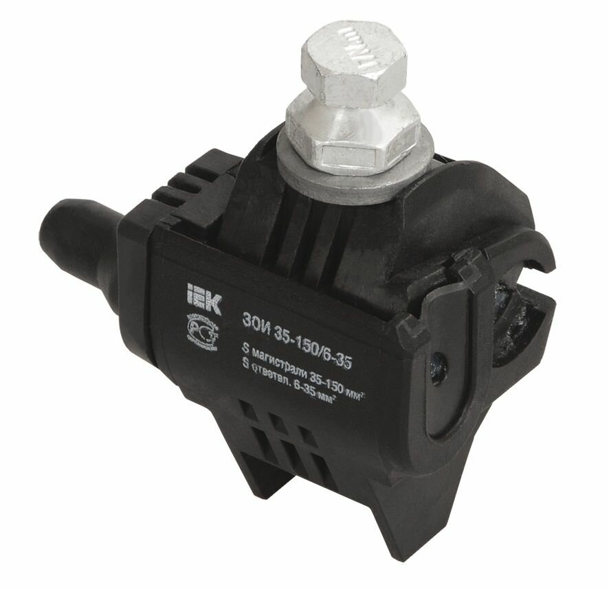**Зажим IEK ЗСГП** используют для подсоединения к магистралям СИП и с неизолированными проводами ИЕК из меди и алюминия. Максимально допустимое напряжение составляет 1 кВ, а номинальное сечение магистрали и ответвлений — 35–95 мм² и 6–35 мм².