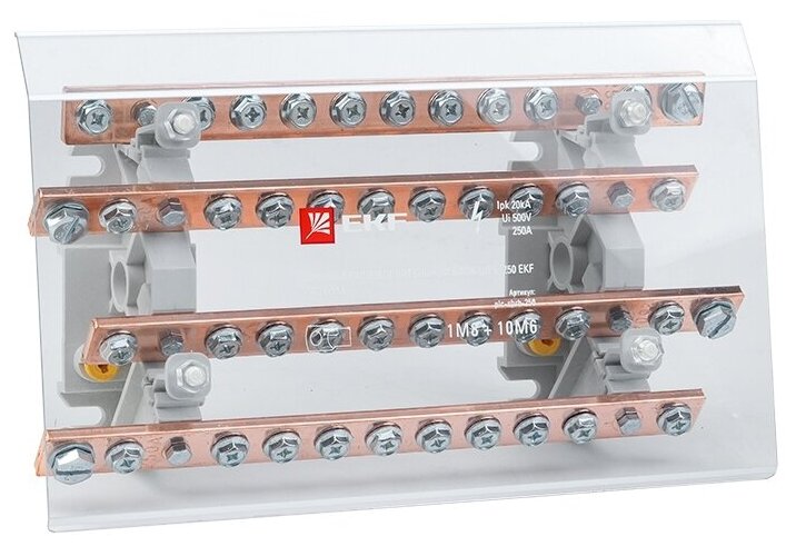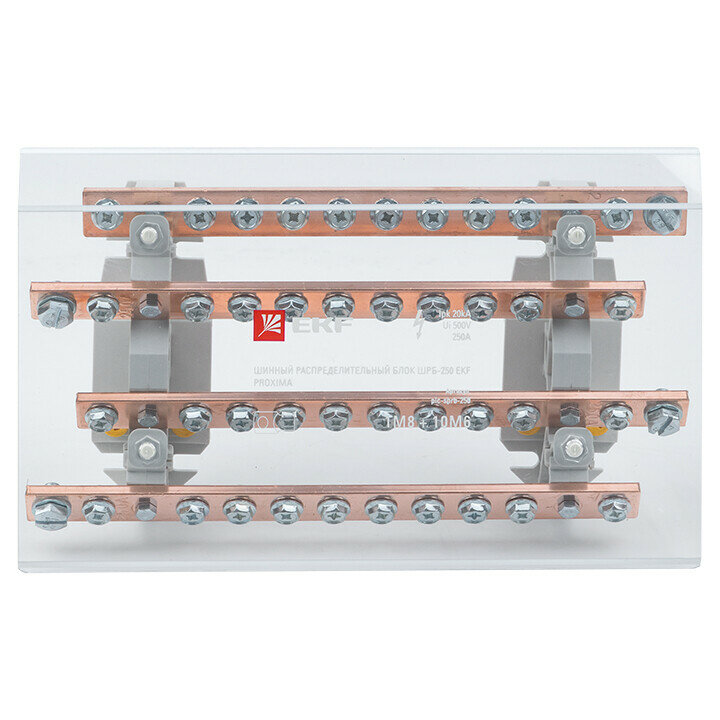 ОПИСАНИЕ. Шинные распределительные блоки ШРБ EKF PROxima применяются в качестве надежных клеммных зажимов при создании упорядоченных систем в распределительных шкафах. Блоки устанавливаются на DIN-рейку или монтажную пластину. Материал контактов – латунь или медь, в зависимости от типоисполнения; материал корпуса – негорючий полиамид РА66; материал винтов – оцинкованная сталь. ПРЕИМУЩЕСТВА. Изолятор для DIN-рейки в блоках 160, 200, 250 А. Легкосъемный прозрачный экран для защиты от случайного прикосновения. Полная гамма – на силу тока от 160 до 400 A. До 53-х точек подключения проводников различного диаметра. Оцинкованные стальные винты входят в комплектацию. ПРИМЕНЕНИЕ. В низковольтных комплектных устройствах; в промышленных установках; на объектах электроснабжения.