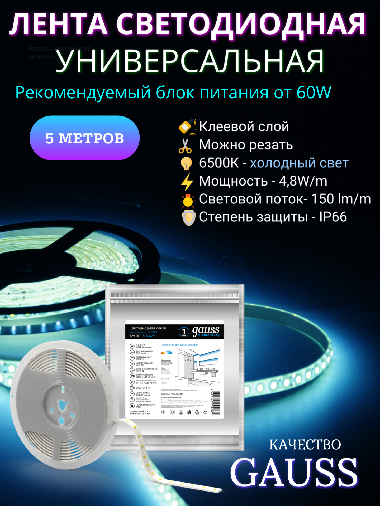 356000305 Лента LED Elementary 2835/60-SMD 4.8W 12V DC холодный белый IP66 (ZIP Bag 5м) Gauss Elementary 356000305