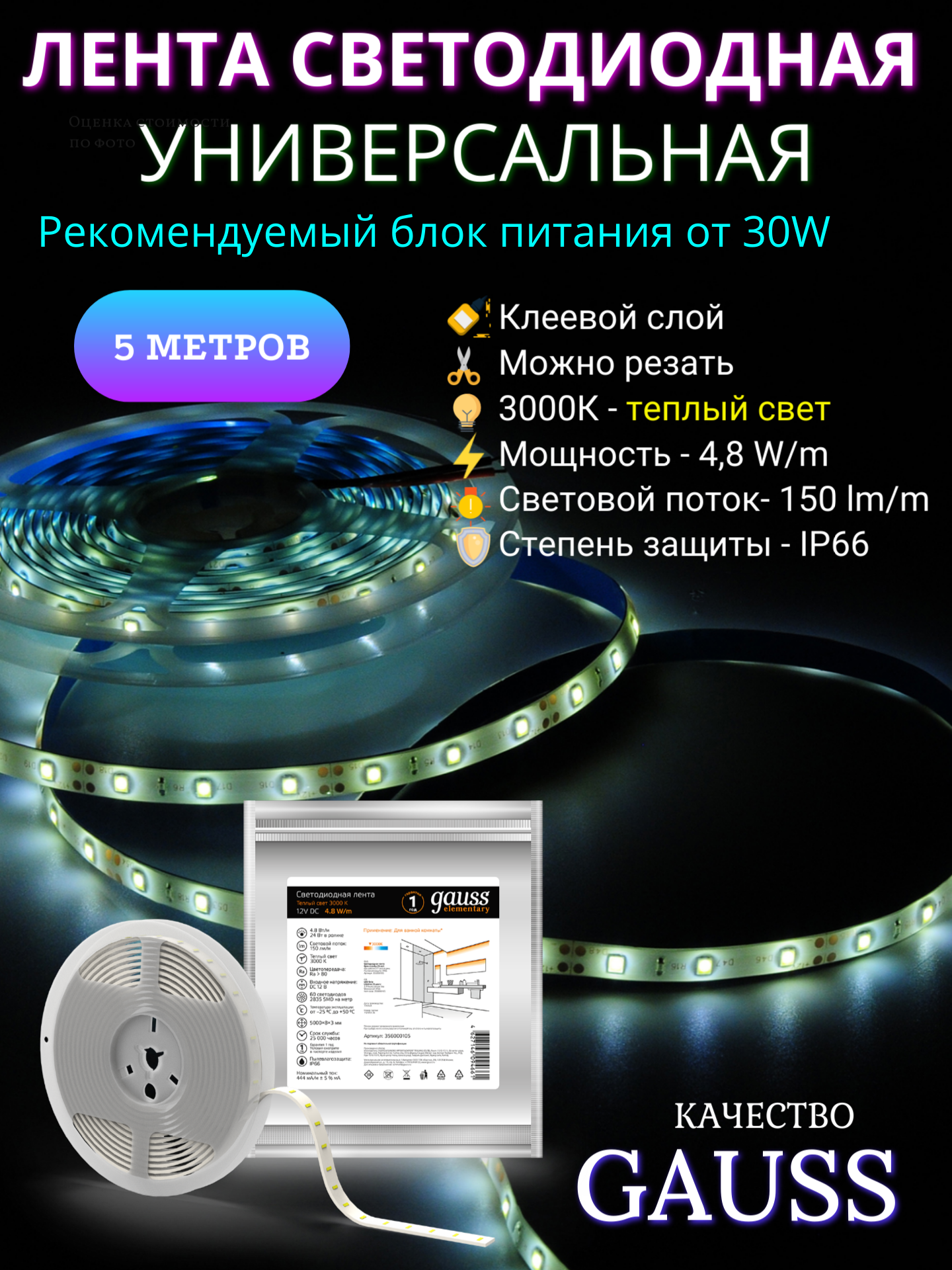 356000105 Лента LED Elementary 2835/60-SMD 4.8W 12V DC теплый белый IP66 (ZIP Bag 5м) Gauss Elementary 356000105