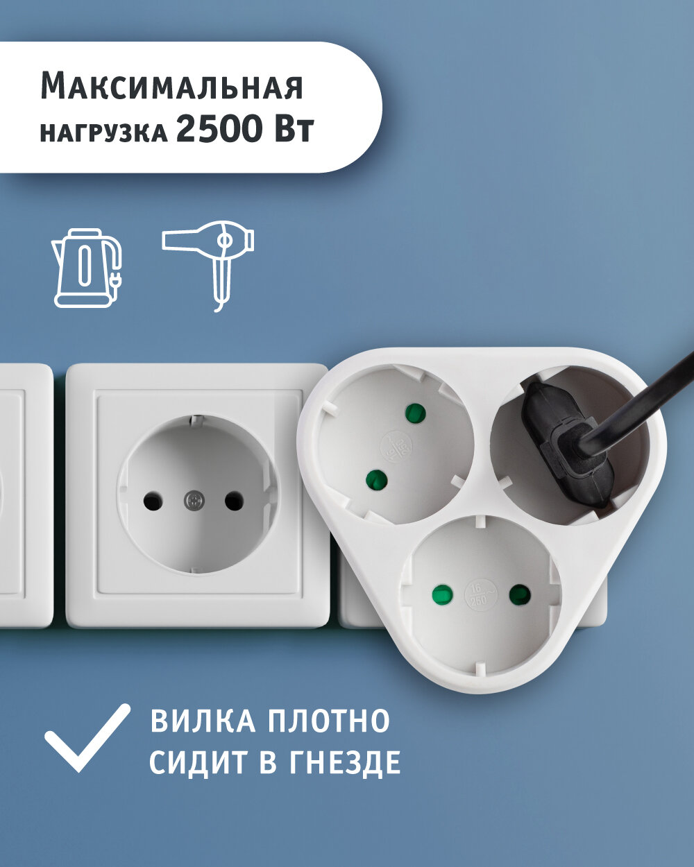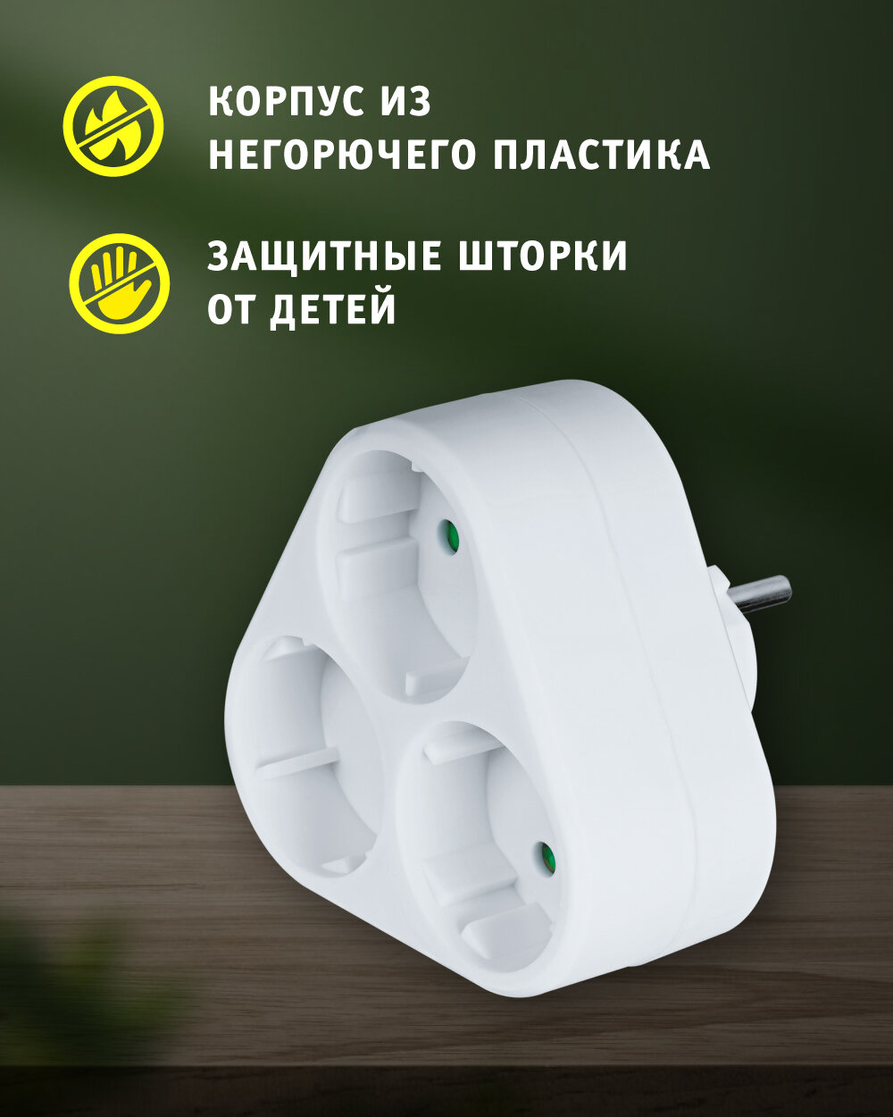 Тройник в розетку изготовлен из негорючего ударопрочного и негорючего ABS пластика, что обеспечивает долгий срок службы и гарантирует надежность в использовании. Цвет переходника для розетки —белый, что позволяет ему гармонично вписаться в любой интерьер. Благодаря компактным размерам и треугольной форме тройник-переходник может быть установлен даже в труднодоступные места. Разветвитель подходит для приборов с вилкой российского и евростандарта. Максимальная мощность всех подключаемых приборов – 2500 Вт. Тройник для розетки оснащен специальными защитными шторками.