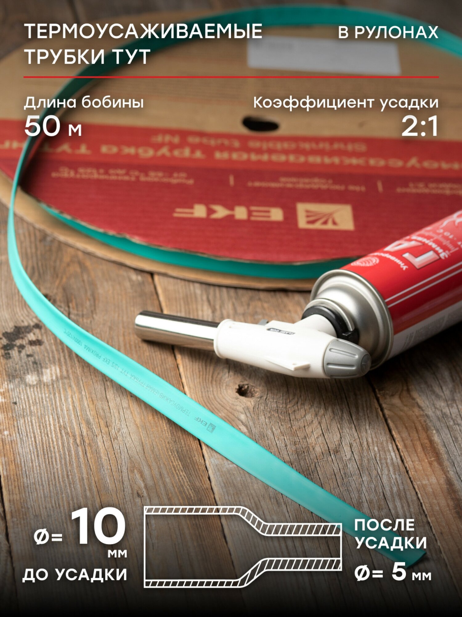 Термоусаживаемая трубка ТУТнг 10/5 зеленая EKF PROxima Полиэтиленовая термоусаживаемая трубка ТУТ может использоваться как электроизоляционный, маркировочный и декоративный материал. Предназначена для герметизации муфт, заделки концов кабелей с помощью колпачков, изоляции кабелей, изолирования жил, мест соединения проводов, бандажирования жгутов проводов, для механической защиты изделий, для защиты от грязи, для цветовой маркировки изделий и т. д. Основное свойство термоусаживаемой трубки – способность сжиматься (усаживаться) под воздействием высокой температуры (от 90 до 125°С). Процесс усадки происходит очень быстро, трубка ТУТ полностью повторяет контуры предмета. Можно использовать тепловой пистолет (фен), что делает термоусаживаемую трубку легкой в бытовом применении, например, в качестве альтернативы изоляционной ленте.