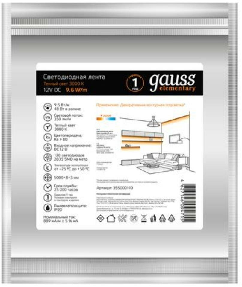 355000110 Лента LED Elementary 2835/120-SMD 9.6W 12V DC теплый белый IP20 (ZIP Bag 5м) Gauss