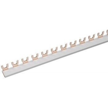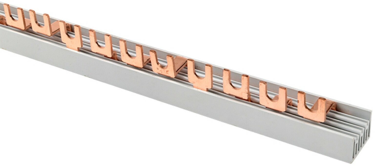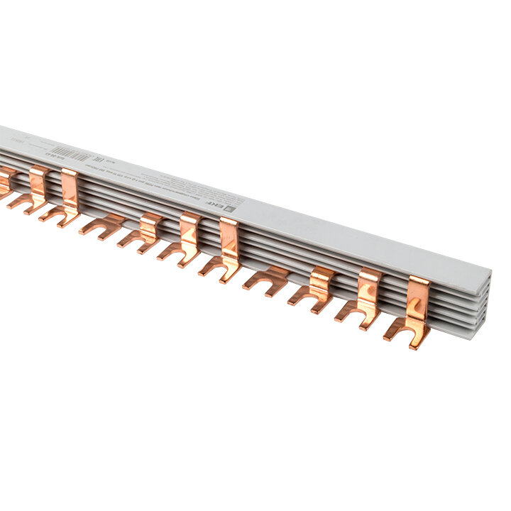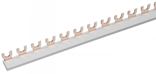 ОПИСАНИЕ. Шины соединительные представляют собой пластины, выполненные из меди (шины на 100 А – из луженой меди), закрепленные в корпусе из диэлектрического материала, не поддерживающего горение, и выпускаются стандартной длиной 1 метр. Шины соединительные делятся на два типа - FORK («вилка») и PIN («гребенка») на номинальные токи 63 и 100 А. Могут быть выполнены в одно- двух- трех- и четырехполюсном исполнений. ПРЕИМУЩЕСТВА. Шины поставляются в комплекте с заглушками. Зажим для подключения автомата и шины тип PIN. Шины на 100 А выполнены с нанесением лужения для одновременного подключения с алюминиевыми проводниками. Вся необходимая информация нанесена на корпус изделия термопечатью. Шина изготовлена из электротехнической меди марки М1. ПРИМЕНЕНИЕ. • Шины с шагом 18 мм используются для коммутации большинства модульного оборудования шириной, кратному 1 модулю; • Шины с шагом 27 мм используются с модульным оборудованием шириной кратному 1,5 модуля (автоматические выключатели ВА 47?100, ВА 47?125); • Шины соединительные 12 модулей широко используются в квартирных щитах благодаря компактному размеру; • Шины соединительные для диф. автоматов удобны в применении благодаря специальному расположению отводов шины.