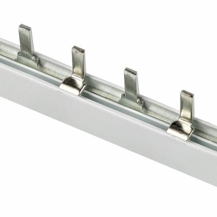 ОПИСАНИЕ. Шины соединительные представляют собой пластины, выполненные из меди (шины на 100 А – из луженой меди), закрепленные в корпусе из диэлектрического материала, не поддерживающего горение, и выпускаются стандартной длиной 1 метр. Шины соединительные делятся на два типа - FORK («вилка») и PIN («гребенка») на номинальные токи 63 и 100 А. Могут быть выполнены в одно-, двух-, трех- и четырехполюсном исполнений. ПРЕИМУЩЕСТВА. Вся необходимая информация нанесена на корпус изделия термопечатью. Шины на 100 А выполнены с нанесением лужения для одновременного подключения с алюминиевыми проводниками. Шина изготовлена из электротехнической меди марки М1. Шины поставляются в комплекте с заглушками. Зажим для подключения автомата и шины тип PIN. ПРИМЕНЕНИЕ. • Шины с шагом 18 мм используются для коммутации большинства модульного оборудования шириной, кратному 1 модулю; • Шины с шагом 27 мм используются с модульным оборудованием шириной кратному 1,5 модуля (автоматические выключатели ВА 47?100, ВА 47?125); • Шины соединительные 12 модулей широко используются в квартирных щитах благодаря компактному размеру. • Шины соединительные для диф. автоматов удобны в применении благодаря специальному расположению отводов шины.