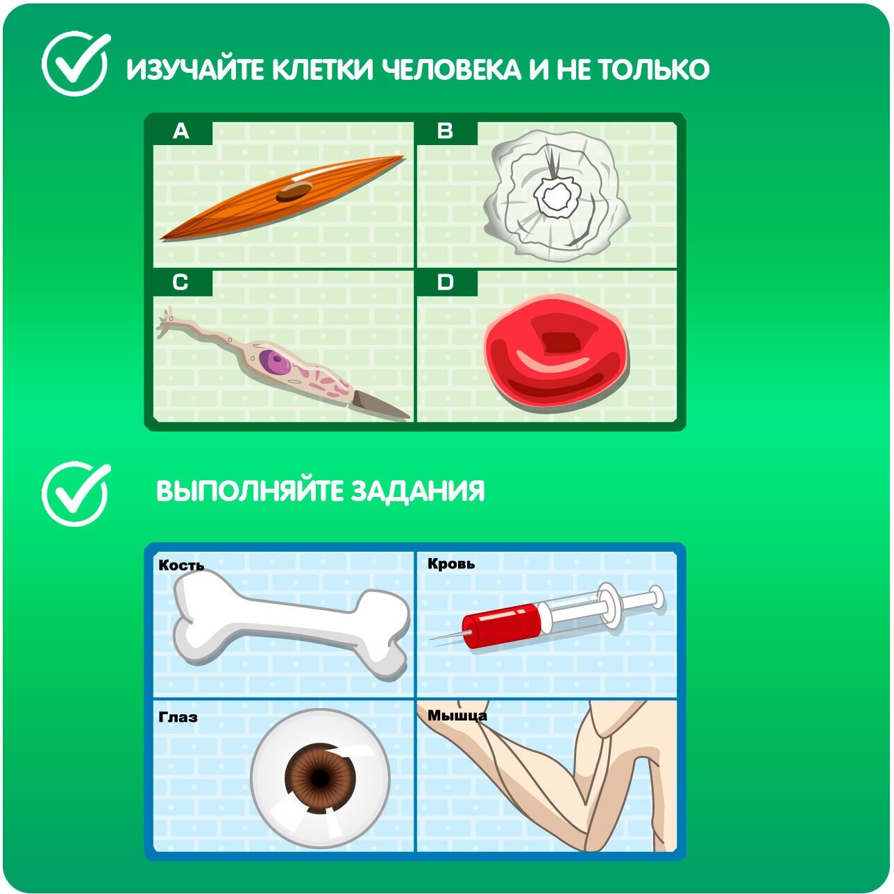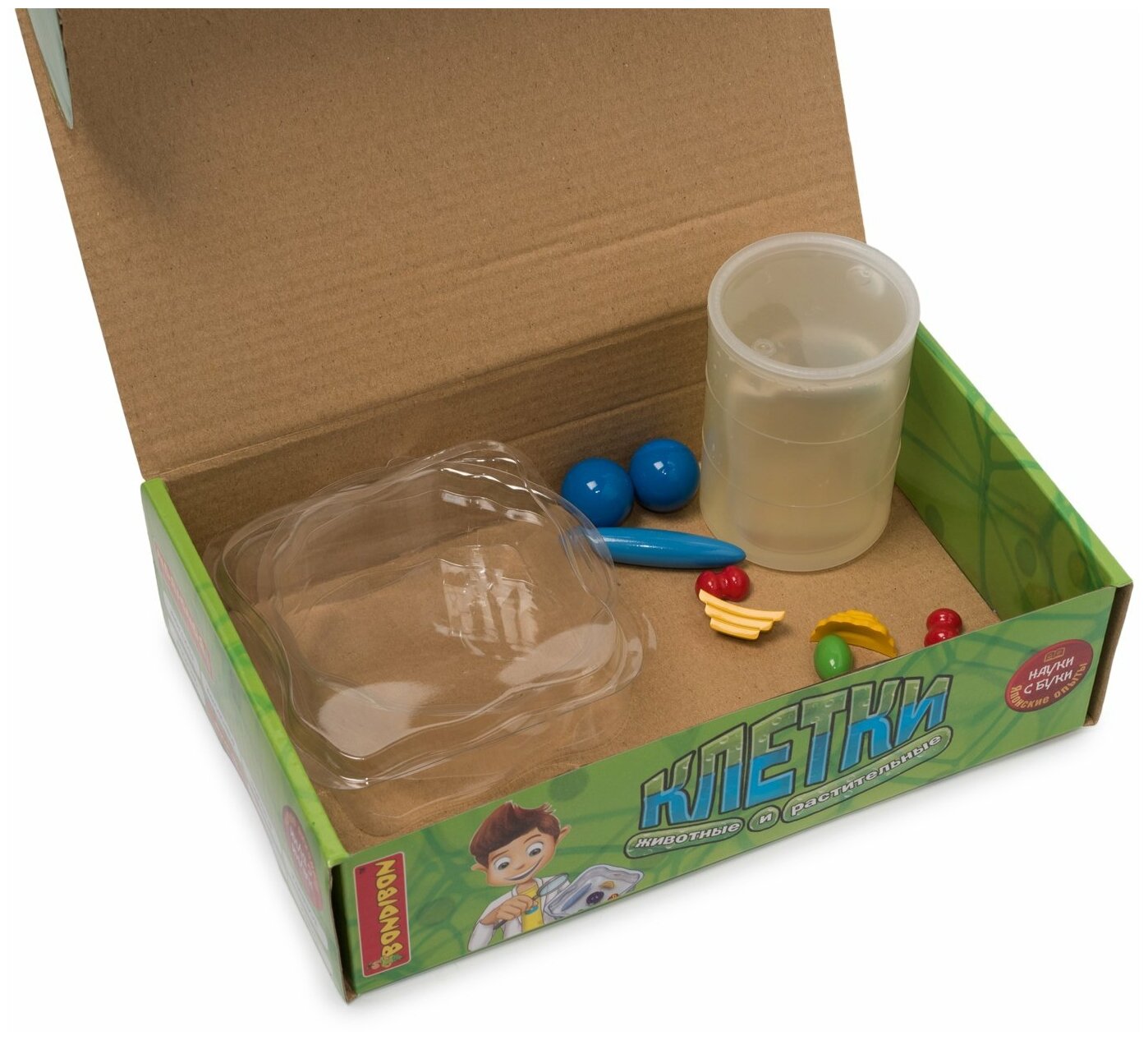 | Состав набора | иллюстрированная инструкция - 1 шт; илистая суспензия - 1 шт; элемент клетки митохондрия - 1 шт; элемент клетки вакуоль - 1 шт; элемент клетки ядро - 1 шт; элемент клетки комплекс гольджи - 1 шт; элемент клетки хлоропласт - 1 шт; контейнер с клеткой (растительная клетка) - 1 шт; контейнер с клеткой (животная клетка) - 1 шт |