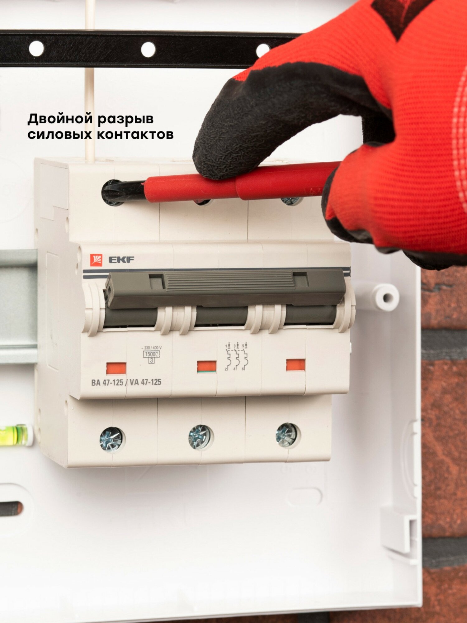 Автоматические выключатели ВА 47-125 EKF PROxima благодаря высокой предельной коммутационной способности 15 кА могут использоваться вместо силовых автоматических выключателей. Выключатели имеют ширину корпуса 1,5 модуля (27 мм), производятся с номинальными токами до 125 А в одно-, двух-, трех- и четырехполюсном исполнении. Для надежного гашения дуги используется двойной разрыв контактов и две дугогасительные камеры. Оптимальная токопроводимость обеспечивается серебросодержащей контактной группой. ОПИСАНИЕ. Предельная коммутационная способность (ПКС) – это максимально возможный ток короткого замыкания, при возникновении которого автоматический выключатель сможет отключить защищаемую им цепь и остаться при этом работоспособным. Номинальный ток – базовое значение тока, в сравнении с которым происходят защитные действия автоматического выключателя по превышению тока нагрузки. Времятоковая характеристика срабатывания – диапазон срабатывания электромагнитной защиты. С – выключатель сработает между 5- и 10-кратным значением номинального тока. Рекомендуется к установке в сетях со смешанной нагрузкой, предполагающей умеренные пусковые токи (гражданское строительство, офисные помещения). D – выключатель сработает между 10- и 14-кратным значением номинального тока. Обычно применяется для подключения электродвигателей, имеющих большие пусковые токи. Класс токоограничения – расцепление происходит за 1/3 полупериода (2,5 - 6 мс). ПРЕИМУЩЕСТВА. Клеммы с насечками для надежного соединения с проводниками. Рабочая зона закрыта диэлектриком. Двойной разрыв контактов. Индикаторное окно состояния контактов. Удобство демонтажа за счет скоса под отвертку. Две дугогасительные камеры для надежного гашения дуги. ПРИМЕНЕНИЕ. Автоматические выключатели ВА 47-125 EKF PROxima применяются в административных, промышленных и жилых сооружениях: проведение тока в нормальном режиме; оперативное управление участками электрических цепей; защита от токов перегрузки и короткого замыкания; в качестве основного элемента системы конечного распределения.