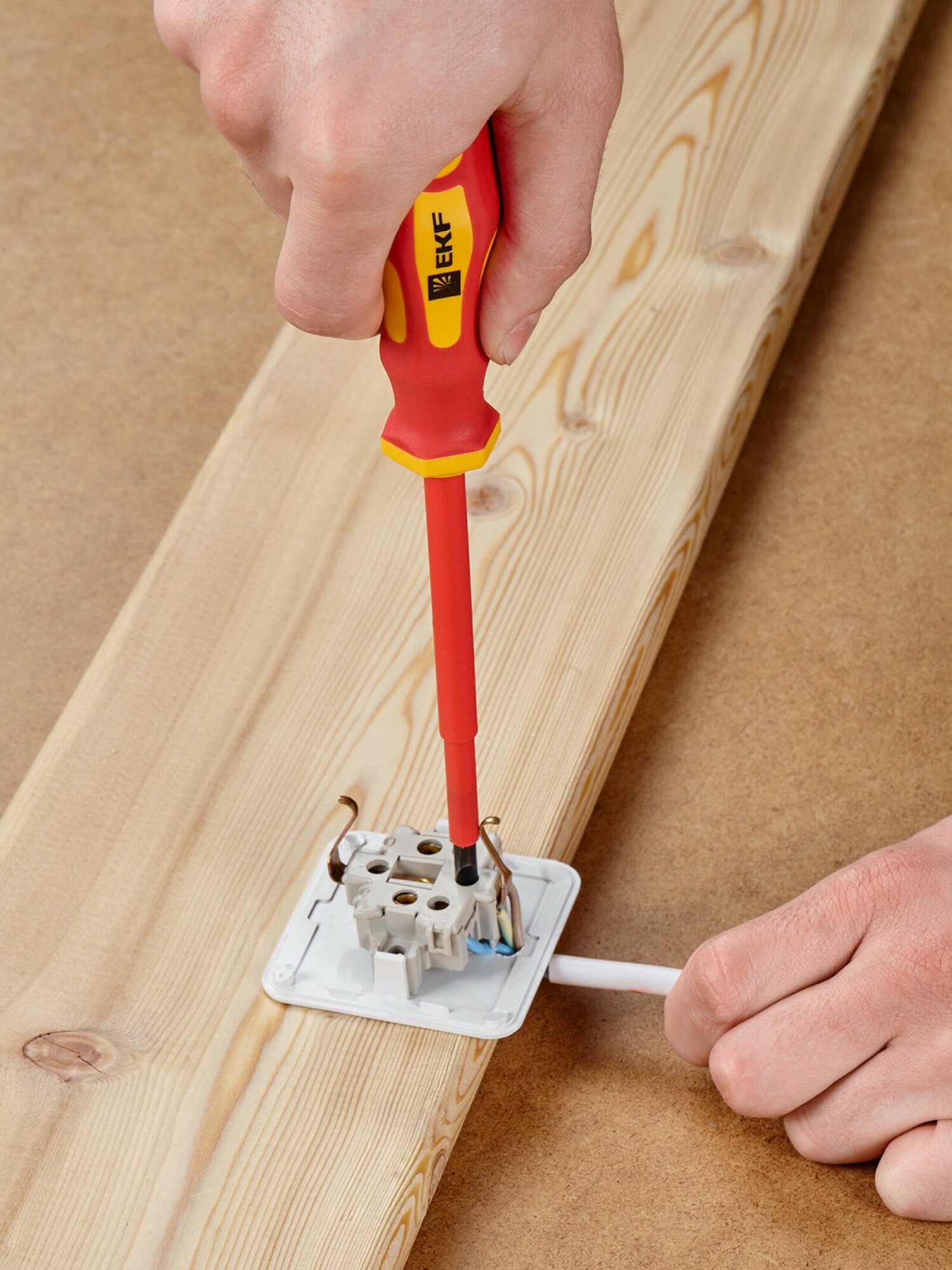 ОПИСАНИЕ. Диэлектрические отвертки – специальный профессиональный инструмент с изоляционным покрытием для безопасной работы с приборами и электросетями, находящимися под высоким напряжением (до 1000В). Отвертки серии Master и отвертки серии Expert изготовлены в строгом соответствии с требованиями EN 60900 / IEC 60900:2004 и каждая отвертка проходит индивидуальное тестирование воздействием напряжения в 10 000 В. ПРЕИМУЩЕСТВА. Рабочая часть отверток выполнена из Cr-V – хромованадиевой стали, что делает ее устойчивой к механическим повреждениям, температурным воздействиям и образованию коррозии. Намагниченный наконечник с дополнительной закалкой Master HRC 50-55 Expert HRC 52-58. Высококачественный материал двухкомпонентной рукоятки обеспечивает плотный контакт и минимизирует эффект скольжения. Специальная форма рукояток обеспечивает увеличенный крутящий момент при минимальных физических затратах. Маркировка типа и размера отвертки на рукоятке. ПРИМЕНЕНИЕ. Диэлектрическая отвертка предназначена для работы с крепежом, который используется в электротехнических устройствах, находящихся под напряжением. Благодаря специальному изоляционному покрытию, исключается риск поражения пользователя током, даже когда напряжение достигает 1000 В.