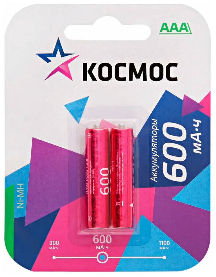 Ni-Mh (никель-металлогидридные) аккумуляторы Космос – заменяют обычные батарейки типоразмера ААА (также называют «мизиньчиковые», на приборах-потребителях может обозначаться как LR03, R03, UM4). Быстро окупятся - можно заряжать сотни раз, экономя на обычных батарейках. В упаковке 2 шт – достаточно для большинства приборов. Емкость 600 мАч – для устройств средней мощности. Важно – перед первым использованием аккумуляторы нужно зарядить.
