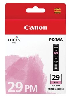 Для создания ярких и качественных изображений на фото-принтере Pixma Pro-1, компания Canon самостоятельно производит и реализует картриджи с чернилами разных цветов, в комплекте картриджей удобнее заменять закончившийся цвет. Фото-картридж PGI-29PM содержит 36 мл краски Magenta (пурпур) для печати фотографий. Его ресурс при формате 10 х 15 см – 1055 изображений, а при формате А3+ его хватает на 228 фото.