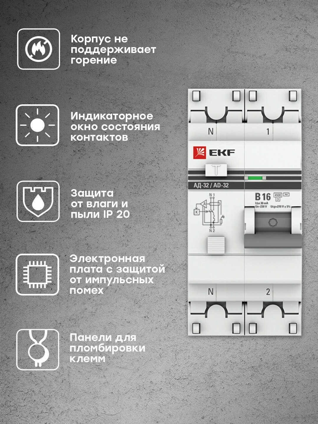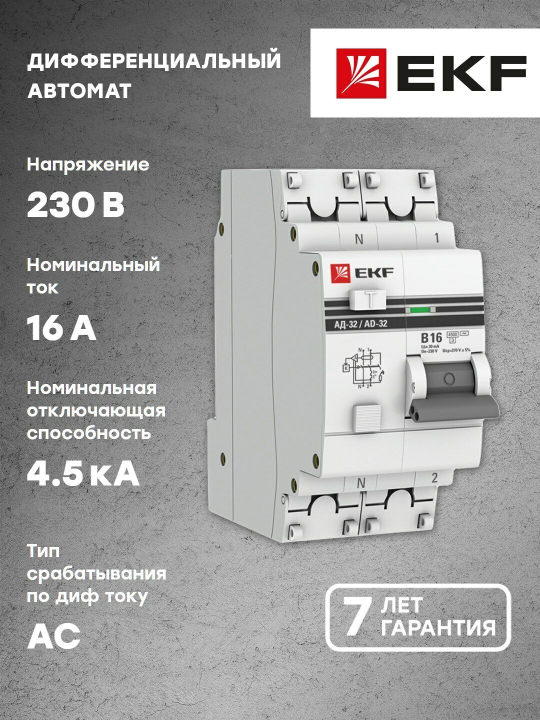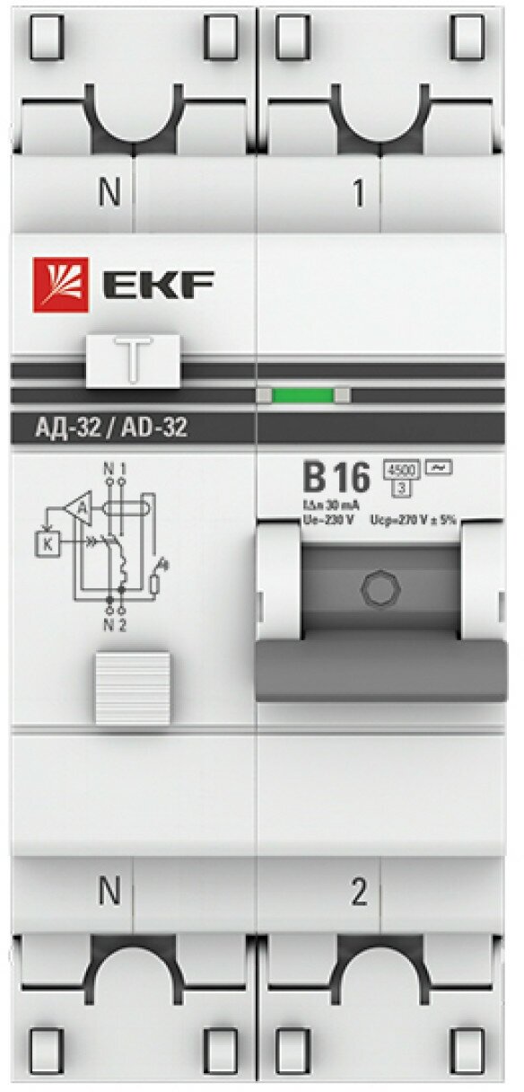 Дифференциальный автоматический выключатель EKF PROxima АД-32, 1P+N, 16А, В, 30мА, тип AC, защита 270В, 4,5кА предназначен для защиты людей от поражения электрическим током при случайном прикосновении к открытым проводящим частям электроустановки, защиты электроустановки (ЭУ) при повреждении изоляции проводников и неисправностях ЭУ, предотвращения возгораний и пожаров, возникающих вследствие протекания токов утечки и развивающихся из них коротких замыканий, замыканий на корпус и замыканий на землю, автоматического отключения участка электрической сети при перегрузках и токах короткого замыкания. Применяется в электрических цепях переменного тока номинального напряжения 230В/400В и частотой 50 Гц бытового и промышленного назначения.