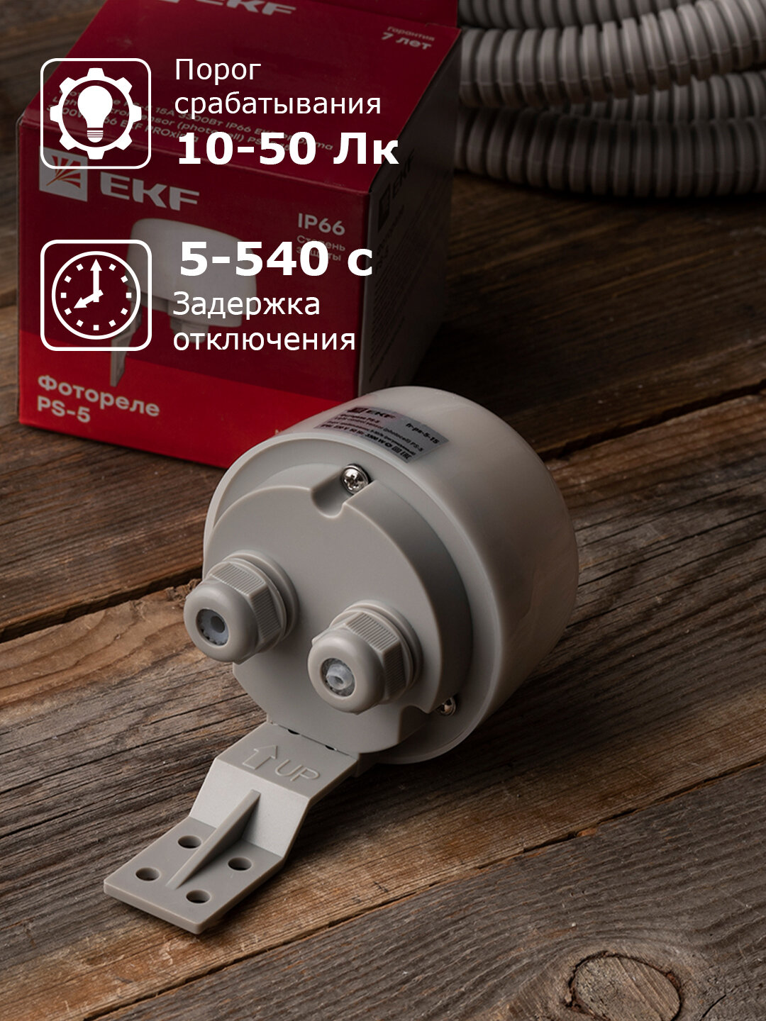 ОПИСАНИЕ. Фотореле PS-5 применяется для управления освещением или другой нагрузкой в зависимости от уровня освещенности. Обычно фотореле применяется в системах управления уличным освещением и включает/выключает нагрузку в момент захода/восхода солнца. К фотореле допускается прямое подключение нагрузки с током не более 15А. Нагрузка большей мощности может быть подключена при помощи контактора. Порог срабатывания по освещенности настраивается в диапазоне 5-50 лк. Фотореле имеет степень защиты IP66, что позволяет устанавливать его в условиях сильного воздействия пыли и влаги. ПРЕИМУЩЕСТВА. Провода для подключения выведены наружу изделия. Скоба для крепления изделий в комплекте. Схема подключения на корпусе изделия. Регулировка срабатывания по уровню освещенности. ПРИМЕНЕНИЕ. Фотореле PS EKF PROxima предназначено для автоматического управления (включение и отключение) освещением внутри зданий и на улице в зависимости от уровня освещенности: уличного освещения, рекламных вывесок,витрин, освещения внутри помещений и т. п. Применяется для экономного использования электроэнергии. Порог срабатывания в зависимости от освещенности регулируется от 5 до 50 Лк (за исключением модели PS-1, где установлен порог 10 Лк).Монтаж фотореле осуществляется при помощи крепежной пластины. В качестве коммутационного элемента служит электромеханическое реле. Корпус фотореле выполнен из не поддерживающего горение пластика. Применяются в однофазных цепях переменного тока номинальным напряжением 230 В частотой 50 Гц. Городская и частная осветительная сеть. Различные объекты строительства и инфраструктуры. Жилой сектор. Дорожное освещение.