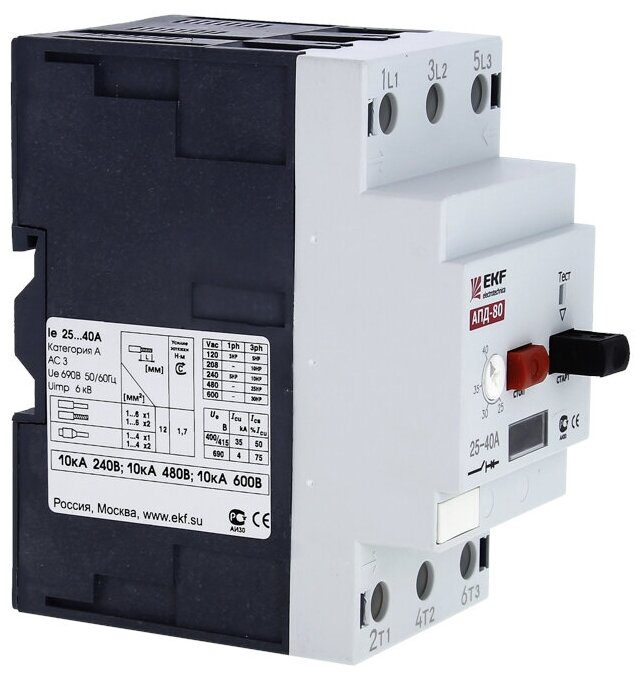 ОПИСАНИЕ. Автоматические выключатели пуска двигателя серии АПД-32 EKF PROxima и АПД-80 EKF PROxima с термомагнитным расцепителем специально предназначены для коммутаций цепей переменного тока напряжением до 690 В частотой 50/60 Гц, а также для управления и защиты трехфазных асинхронных двигателей от перегрузки, обрыва фазы, короткого замыкания. ПРЕИМУЩЕСТВА. Клеммные зажимы маркированы согласно ГОСТ. Кнопка «Тест» проверяет работоспособность механизма расцепления. Большой ассортимент доп. устройств. Маркировочная площадка в комплекте для идентификации АПД в щите. Тарельчатые зажимы обеспечивают надежное крепление проводника. Корпус из пластика, не поддерживающего горения. Подробная информация на каждом автомате. Защита от тока перегрузки, пропадания фазы (срабатывает по тепловому току оставшихся двух фаз), защита от КЗ (специально для двигателя ток отсечки 14 *In). Удобная настройка уставок теплового расцепителя: шкала в амперах. ПРИМЕНЕНИЕ. • Управление и защита насосов, в ЖКХ, на дачных и приусадебных участках. • Вентиляционные системы. • Управление воротами. • Строительная техника. • Управление подъёмными механизмами.