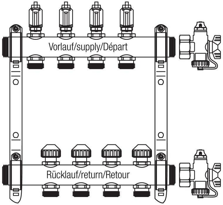 2 распределительные трубы 1" для подачи и отвода теплоносителя с возможностью подключения с обеих сторон;