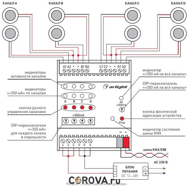 Универсальный диммер стандарта KNX с токовым выходом для установки на DIN-рейку. Возможность ручного управления. Питание DC 12-48V, ток нагрузки 350/700/1000 mA на канал, 4/2/1 канала управления. Мощность 16.8-134.4 W.