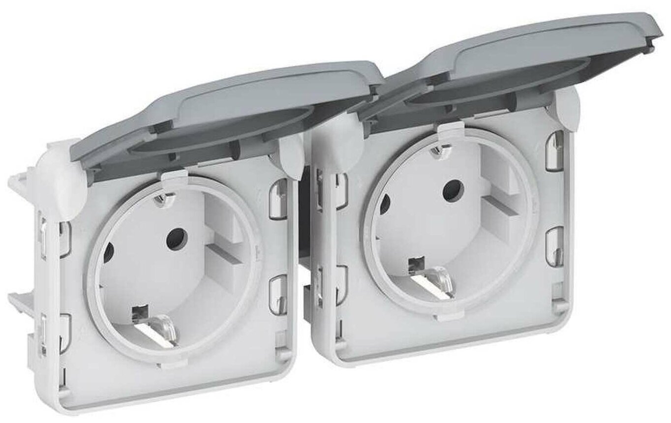 Plexo 069576 Розетка двойная с заземляющим контактом (16 А IP55 под рамку открытая установка крышка горизонтальная серая) Legrand 069576 Plexo
