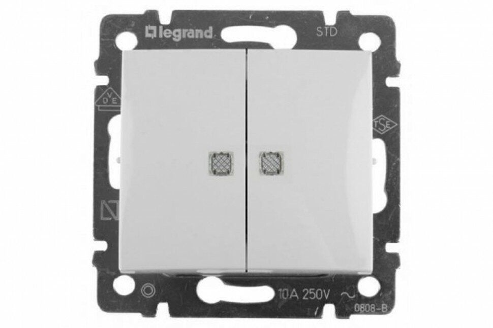 Valena 774428 Выключатель двухклавишный (10 А подсветка под рамку с/у белый) Legrand (размер: 71 x 71 x 21мм)