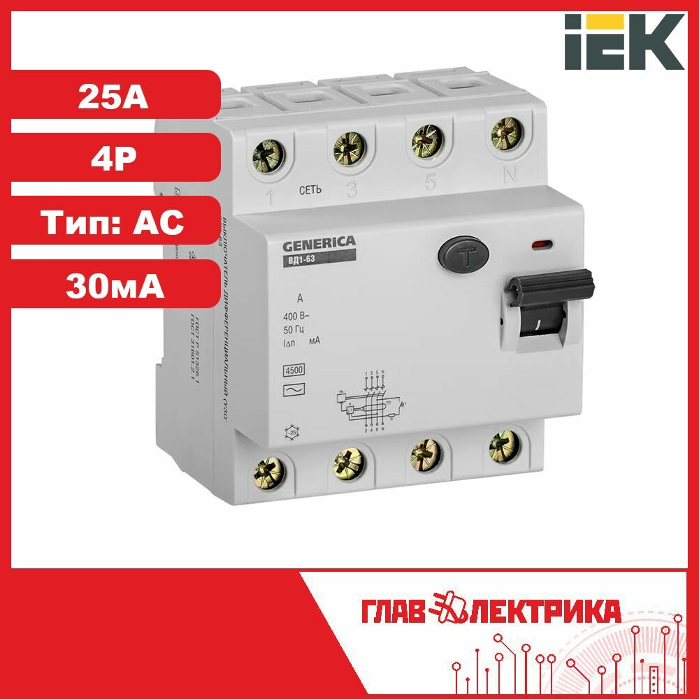 Generica MDV15-4-025-030 Выключатель дифференциального тока четырехполюсный 25А 30мА (тип AC) IEK