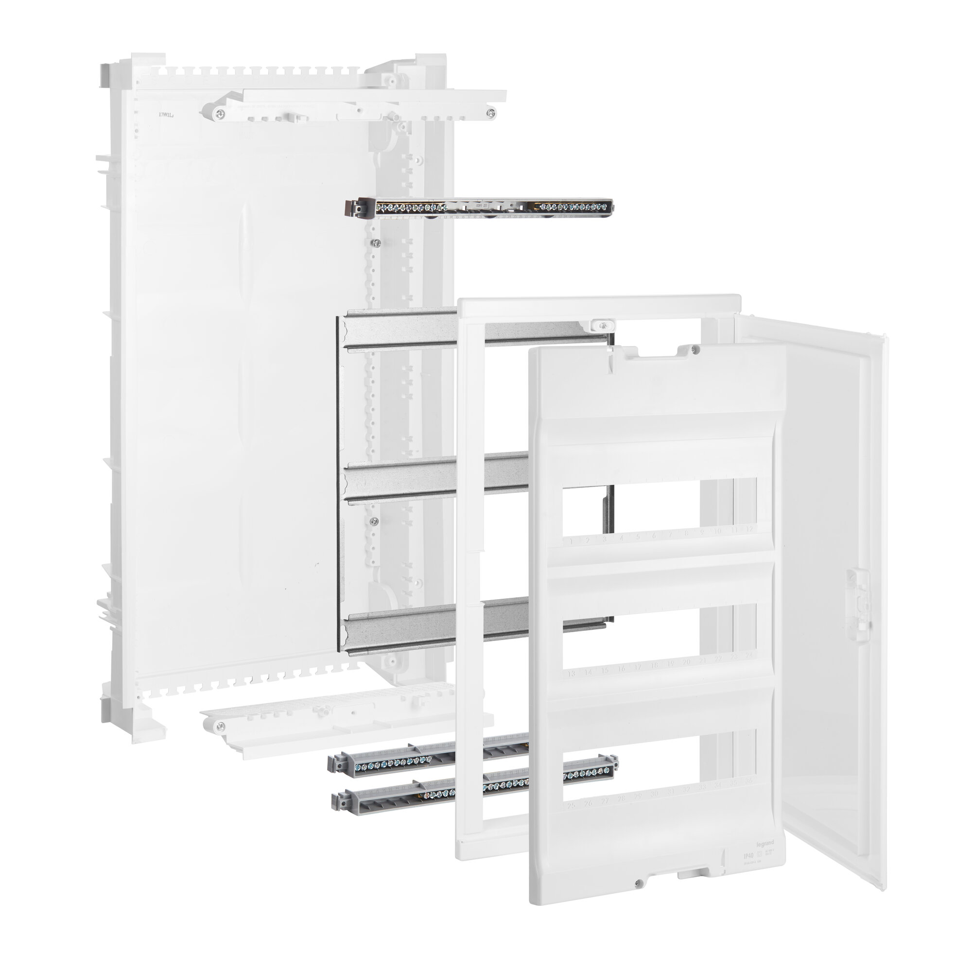 Устройство Щит Legrand Nedbox в нишу на 36 (+6) модулей (3х12) с шинами N+PE с белой дверью Артикул: 001413 Legrand Бокс скрытого монтажа Легранд Недбокс в стену, трехрядный, на тридцать шесть + шесть модулей с клеммами нейтраль + земля с белой дверцей Характеристики: Количество модулей: 36. Степень защиты: IP 40. Цвет: белый. Непрозрачная дверь. Размеры ниши (ВхШхГ): 555х330х86 мм. Габаритные размеры (ВхШхГ): 585х350х105 мм. Комплектация: 3 DIN-рейки 2 пластины для в вода кабелей 2 шины «земля-ноль», рама для уменьшения глубины монтажа.