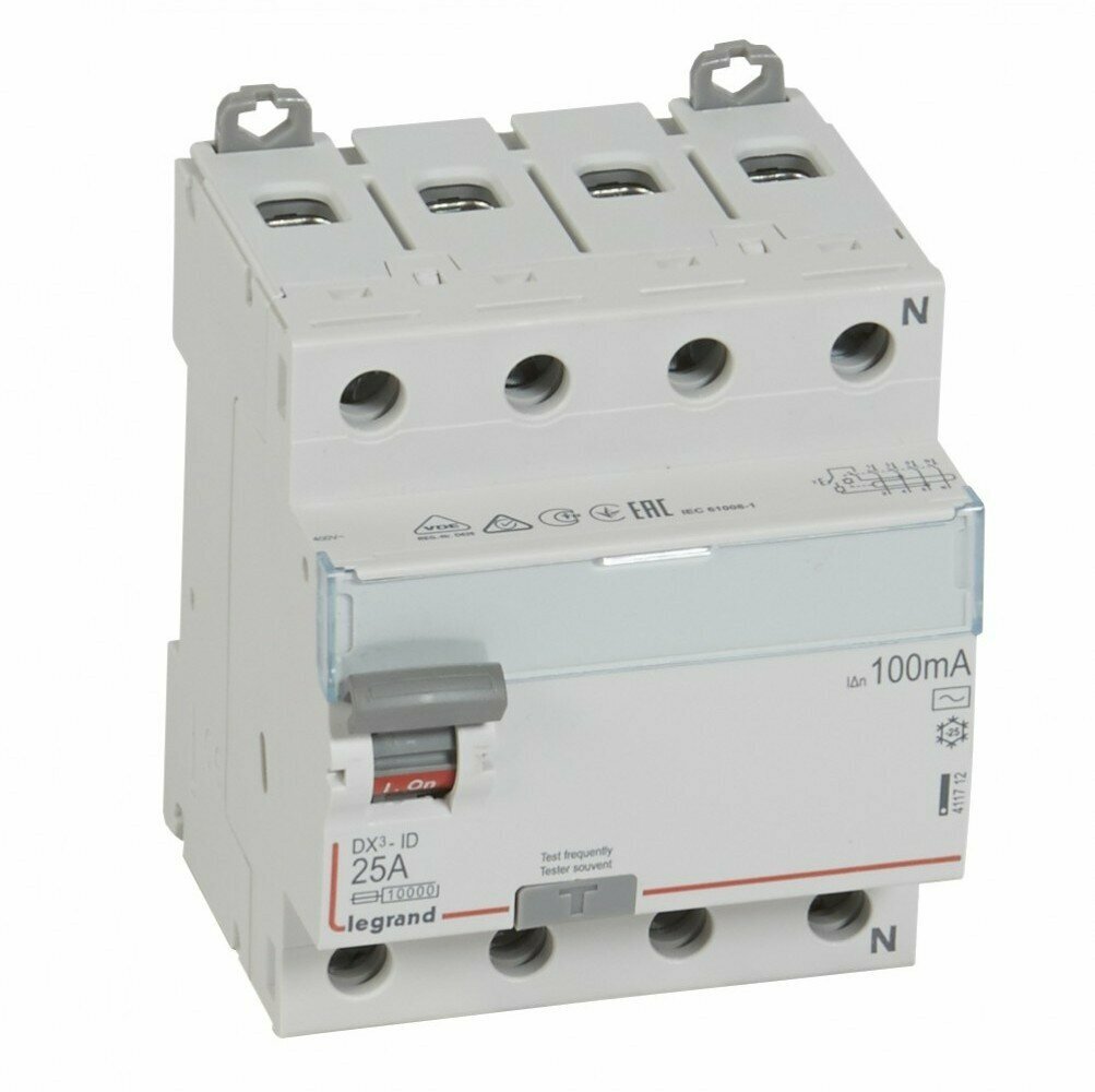DX3 411712 Выключатель дифференциального тока четырехполюсный 25А 0.1А (тип AC) Legrand