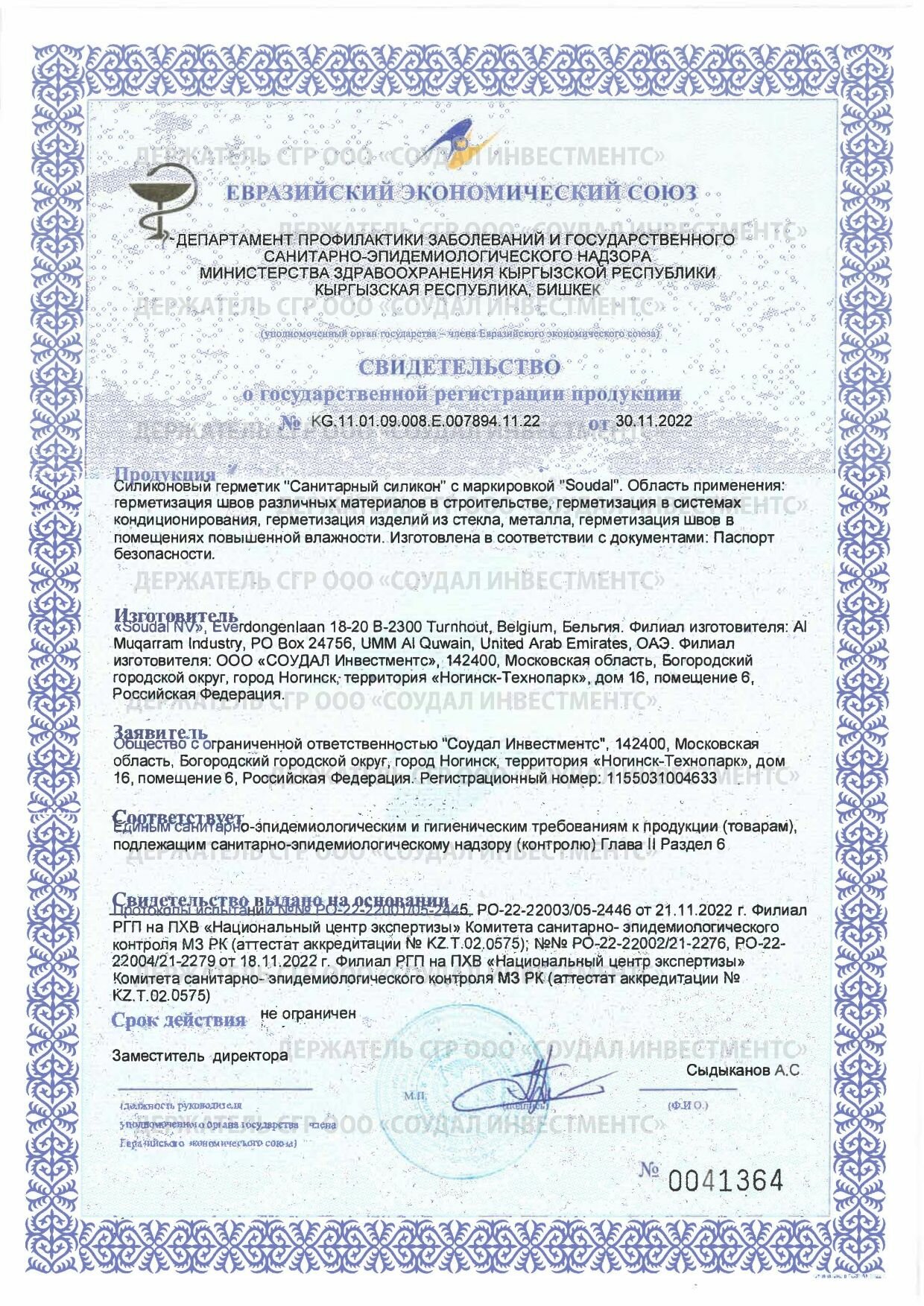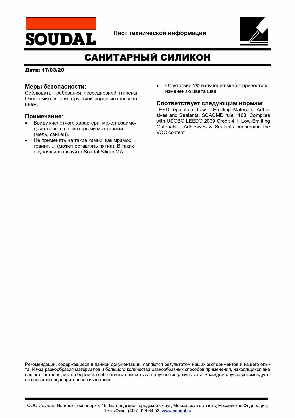 Соудал Санитарный силикон – высококачественный силиконовый герметик c кислотным отвердением и повышенной стойкостью к воздействию влаги, грибка и плесени (содержит фунгициды). Обладает отличной адгезией к распространенным санитарно-техническим материалам - стеклу, керамике и глазурованной поверхности, а также бетону и кирпичу, дереву и некоторым металлам (не рекомендуется применять к ПВХ и акрилу, а также подверженным коррозии металлам). После отвердения сохраняет эластичность, устойчив к изменению температур, УФ лучам и образованию плесени.