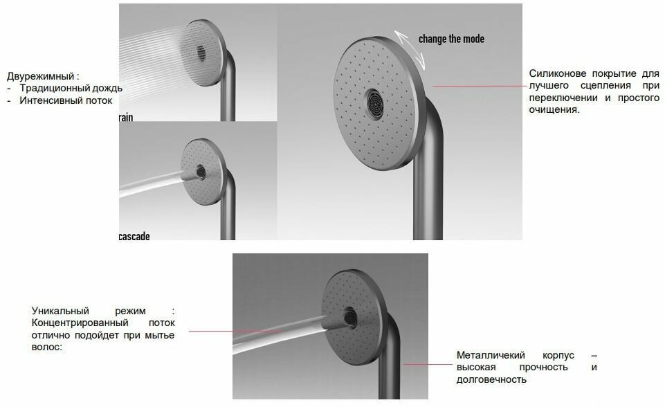 2 режима: традиционный дождь, интенсивный поток. Концентрированный поток - отлично подойдет при мытье волос.
