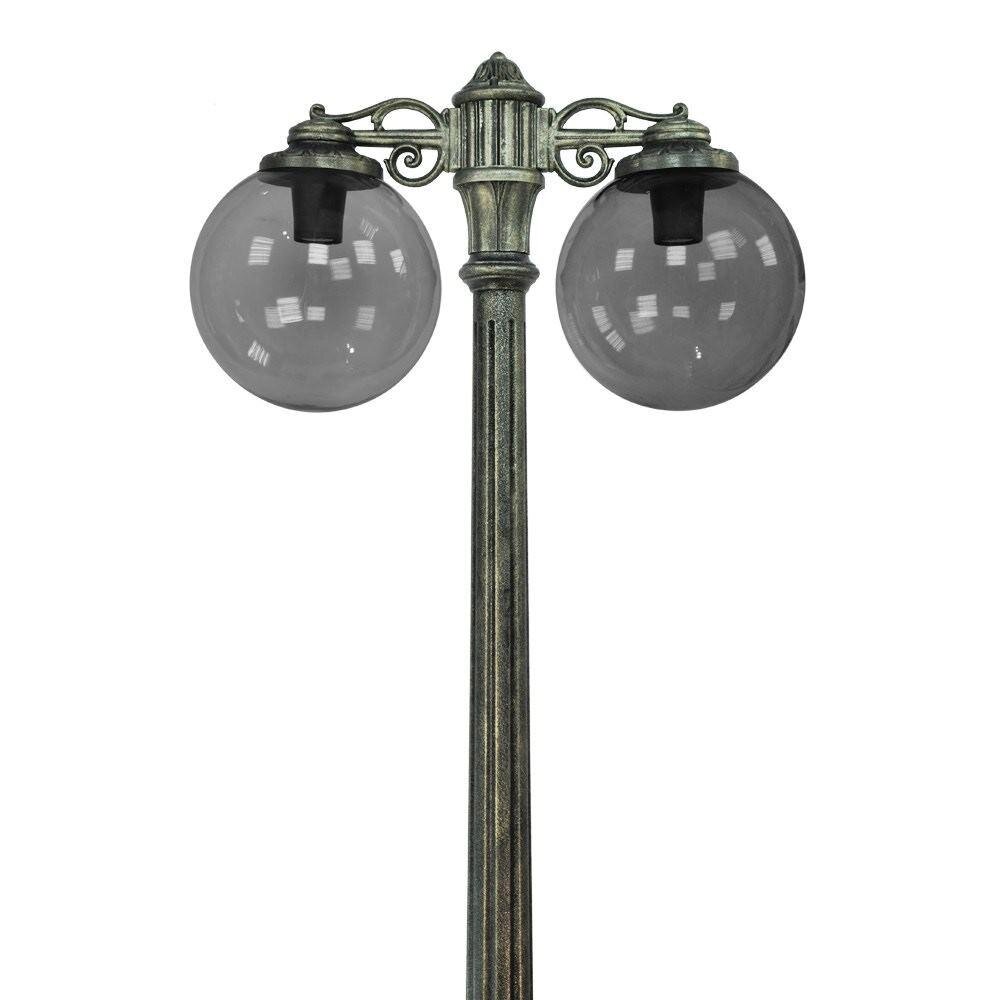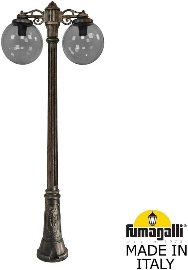 Садовые светильники - столбы Fumagalli серии GLOBE 300, модель GIGI/BISSO/GLOBE 300 2L DN. Парковый торшер, столб освещения GIGI с двумя уличными фонарями GLOBE 300 на консолях BISSO малого размера. Монтаж кронштейнов фонарей - "вниз". Используются для архитектурного и ландшафтного освещения в стиле "классика". Место установки столбиков освещения - парковые дорожки, тротуары, газоны в парках и скверах, а так же ландшафтные и архитектурные объекты. Изготовлены в Италии, по уникальным технологиям "Fumagalli" из современного композитного полимера RESIN. Этот материал в 5 раз прочнее металла, не ржавеет, не окисляется, не выгорает на солнце, его не нужно красить. Все светильники пыле-влаго защищены по стандарту IP65 (Пыленепроницаемые, защита от водяных струй с любого направления). В комплекте идут крепежи и закладные элементы. Рассеиватель выполнен из антивандального, не мутнеющего и не горючего PMMA (ПолиМетилМетаАкрилат).