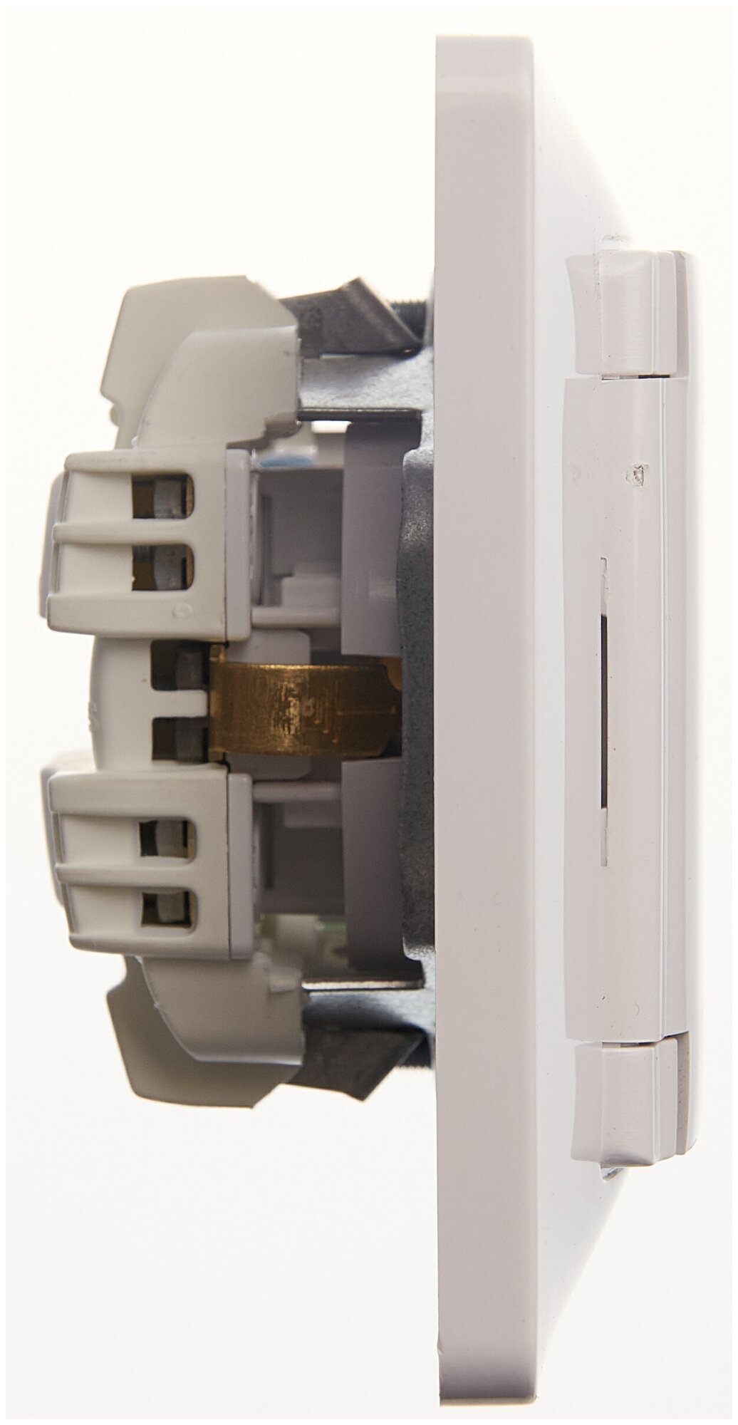 Розетка выполнена из высококачественных материалов, что обеспечивает долговечность и надежность устройства. Ее белый цвет и глянцевая отделка элегантный и современный вид. Установка розетки очень простая.