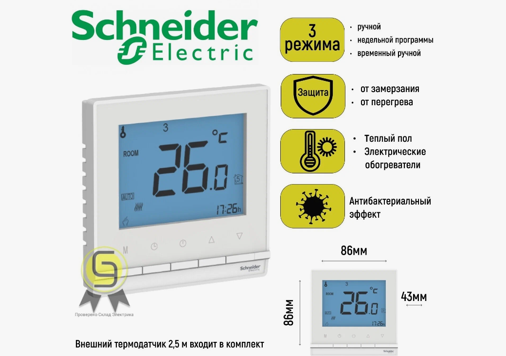 Терморегулятор с датчиком Schneider Electric AtlasDesign ATN000138 (белый), от +5°С до +35°С, 16A изготовлен из пластика с ионами серебра в белом цвете. Обеспечивает антибактериальный эффект.Электронный механизм с цифровым дисплеем обеспечивает точное поддержание заданных значений и позволяет запрограммировать режим работы и расписание на каждый день недели.Может контролировать как теплый пол, так и электрические обогреватели.Внешний термодатчик 2.5 м входит в комплект.Встроенная защита от замерзания и перегрева.Индикация фактическое температуры.