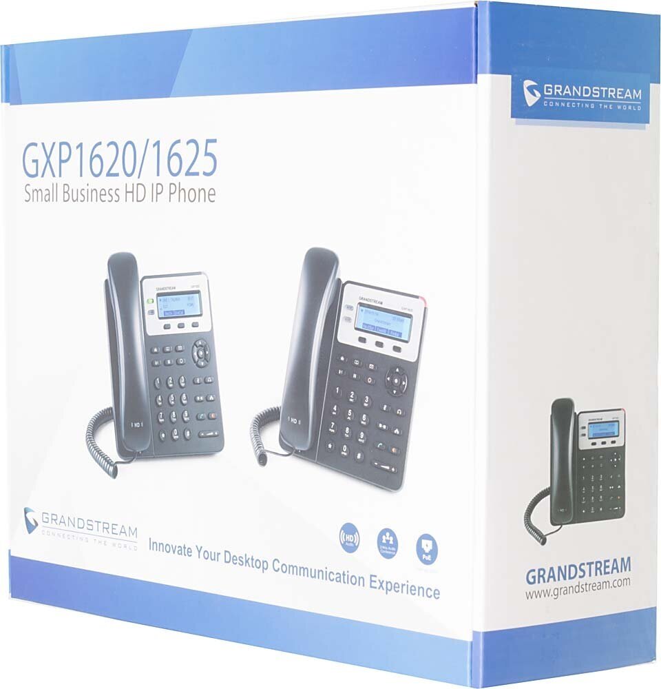 | Комплектация | Телефон VoiceIP Grandstream GXP-1620, телефонная трубка со шнуром, основание, универсальный блок питания, руководство пользователя |