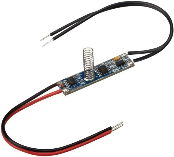 Диммер с подсветкой, встраиваемый в профиль, реагирует на прикосновение к экрану, короткое нажатие - вкл/выкл, длинное нажатие - диммирование. Для профилей с внутренней высотой (пов. профиля - пов. экрана) от 12 до 20 мм. 12-24V, 3A. Размер 42x10x21mm