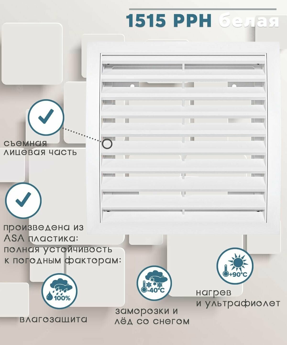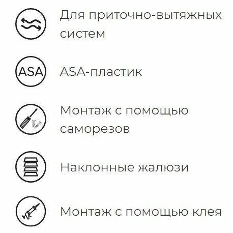 Данная серия изготовлена из ASA-пластика, который является аналогом привычного вам ABS-пластика, но отличается от него атмосферостойкостью и сверхнадежностью. Изделия из ASA-пластика в процессе эксплуатации на внешней стороне зданий не желтеют, не теряют своей прочности, не становятся хрупкими и не трескаются при перепадах температуры. Таким образом, приобретая вентиляционные решетки из ASA-пластика, вы можете быть уверены в том, что они прослужат вам долго и сохранят первоначальный вид.