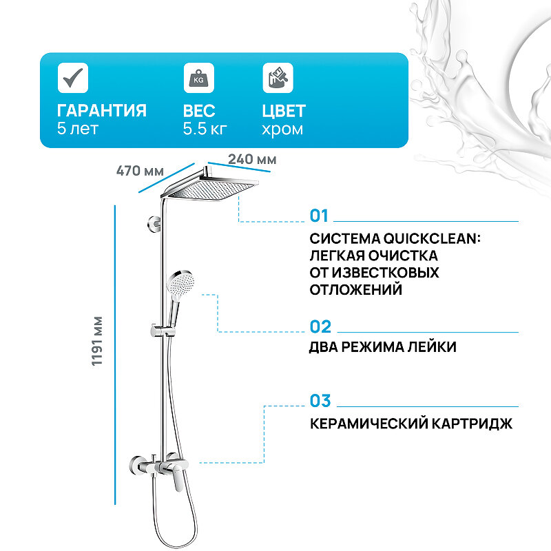 | Оснащение | душевая лейка, кронштейн для верхнего душа, смеситель, шланг для душа, настенный держатель |