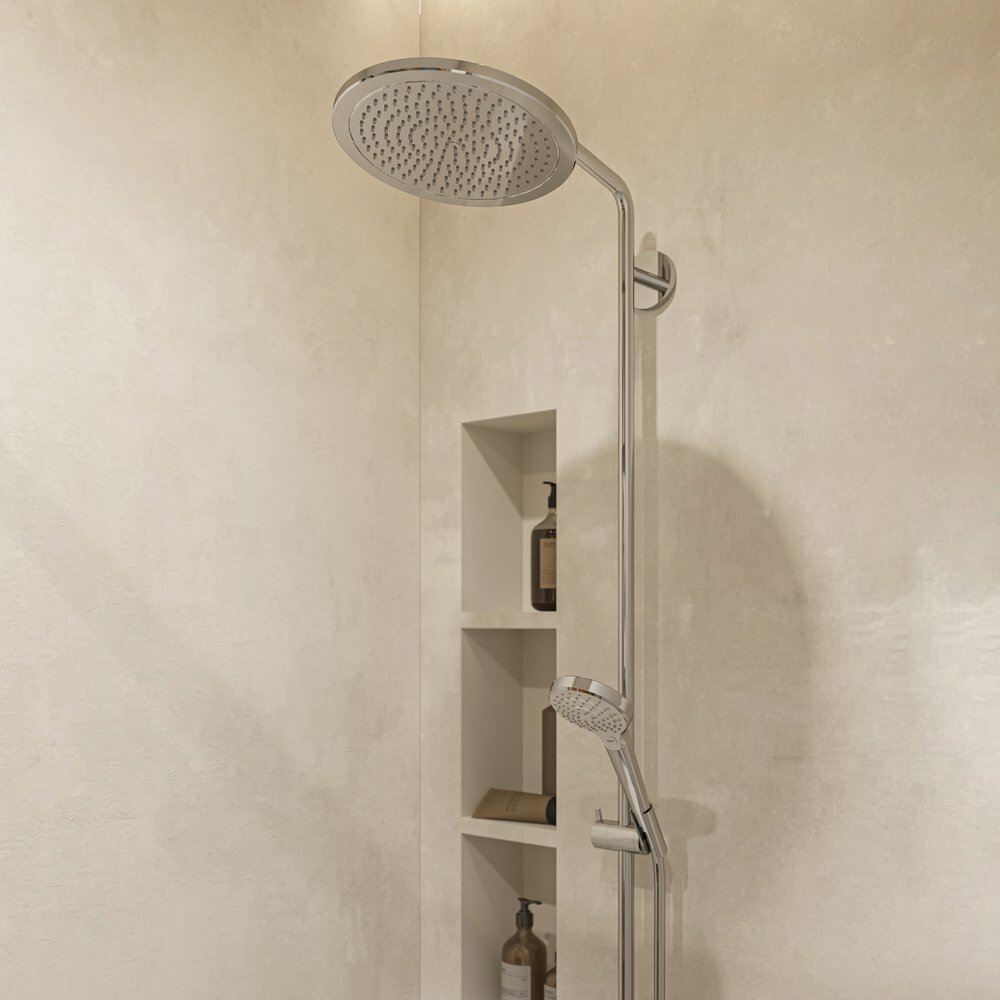 Душевая стойка Hansgrohe Croma Select 280 26792000, размер душевого диска: 280 мм, регулируемый угол верхнего душа, тип струи: RainAir, расход воды для струи RainAir (при 3 бар): 16 л / мин, поворотный держатель для душа, термостат Ecostat Comfort, расход воды для излива на ванну: 20 л/мин, предохранительный ограничитель при 40°C, регулируемый ограничитель температуры горячей воды, пользовательское управление посредством вращения рукоятки, вид монтажа: наружный монтаж, величина соединения DN15, межосевое подключение 150 мм ± 12 мм, регулируемое по высоте крепление ручного душа. Состоит из: душевой шланг 200 см (# 28274000), ручной душ Multi (# 26800400), верхний душ 280 1jet (# 26220000).