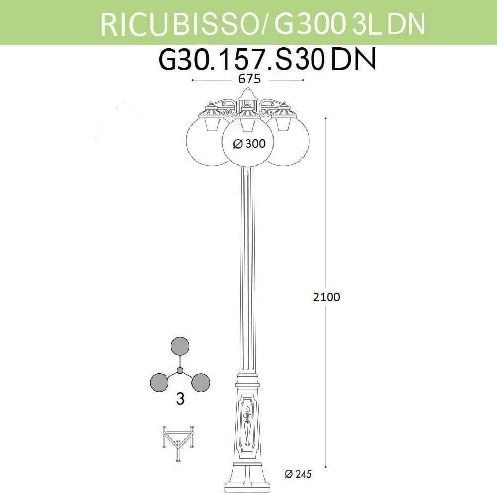 Садовые светильники - столбы Fumagalli серии GLOBE 300, модель RICU/BISSO/GLOBE 300 3L DN. Парковый торшер, столб RICU с тремя уличными фонарями GLOBE 300 на консолях BISSO малого размера. Монтаж кронштейнов освещения "вниз". Используются для архитектурного и ландшафтного освещения в стиле "классика". Место установки столбиков освещения - парковые дорожки, тротуары, газоны в парках и скверах, а так же ландшафтные и архитектурные объекты. Изготовлены в Италии, по уникальным технологиям "Fumagalli" из современного композитного полимера RESIN. Этот материал в 5 раз прочнее металла, не ржавеет, не окисляется, не выгорает на солнце, его не нужно красить. Все светильники пыле-влаго защищены по стандарту IP65 (Пыленепроницаемые, защита от водяных струй с любого направления). В комплекте идут крепежи и закладные элементы. Рассеиватель выполнен из антивандального, не мутнеющего и не горючего PMMA (ПолиМетилМетаАкрилат).