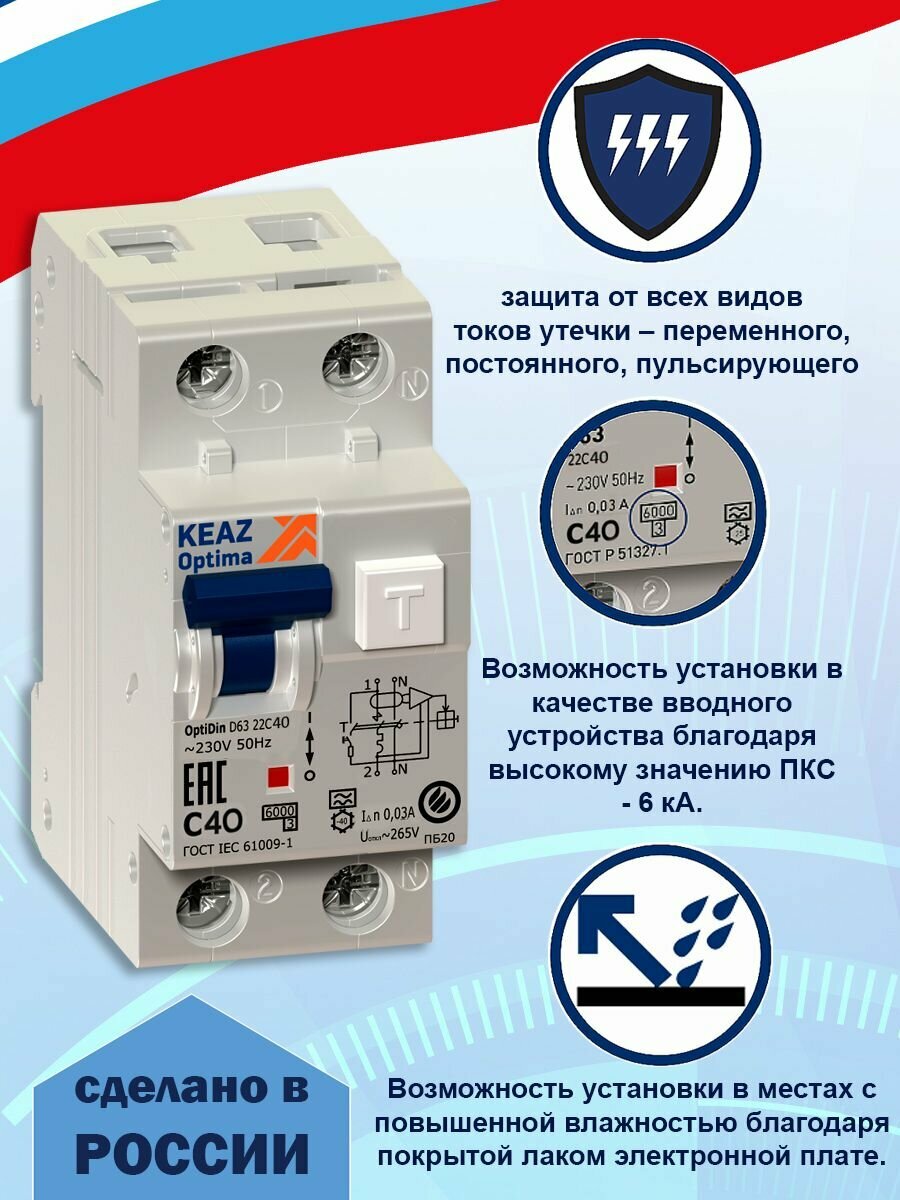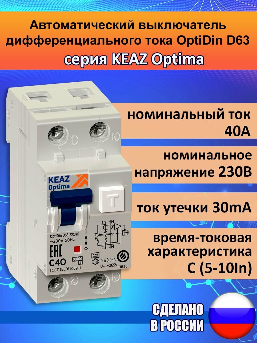 OptiDin 103511 Автоматический выключатель дифференциального тока двухполюсный 40А (тип AC 6 кА 30 мА) КЭАЗ D63 УХЛ4