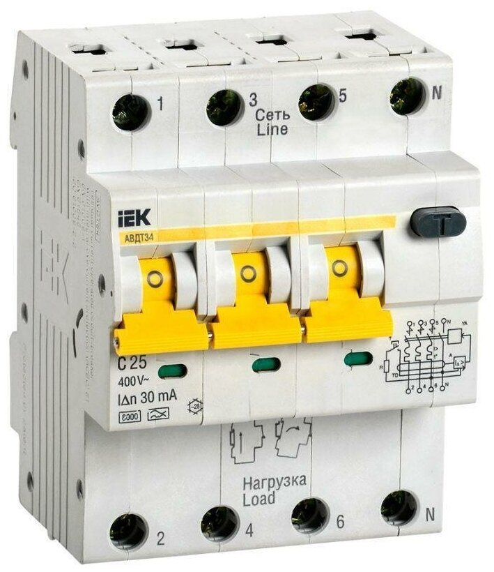 АВДТ34 выпускаются в четырехполюсном исполнении на номинальные токи 6, 10, 16, 25, 32, 40, 50, 63 А и номинальные отключающие дифференциальные токи 10, 30, 100, 300 мА.