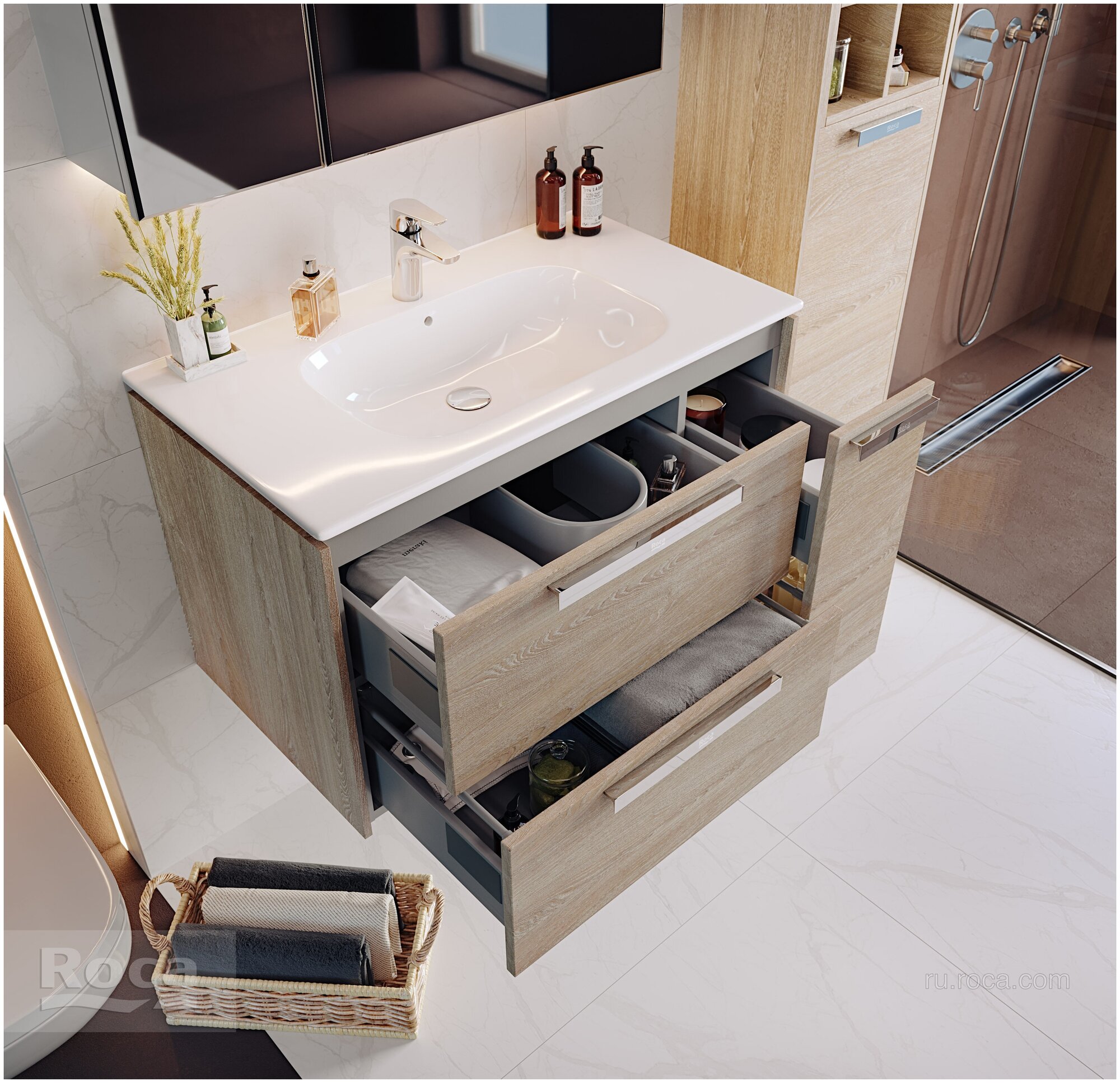 Мебель компании Roca отличается превосходным внешним видом, благодаря которому она идеально впишется в любой интерьер ванной комнаты. Данная модель изготовлена из высококачественных материалов, обеспечивающих не только длительный срок эксплуатации, но и сохраняющих первозданный внешний вид долгое время. Кроме того, дизайн этой коллекции интерпретирует формы, отдавая должное функциональности и эмоциональным характеристикам. Такое понимание дизайна подчеркивает вневременную природу продукта, превосходящего эфемерные тенденции моды.