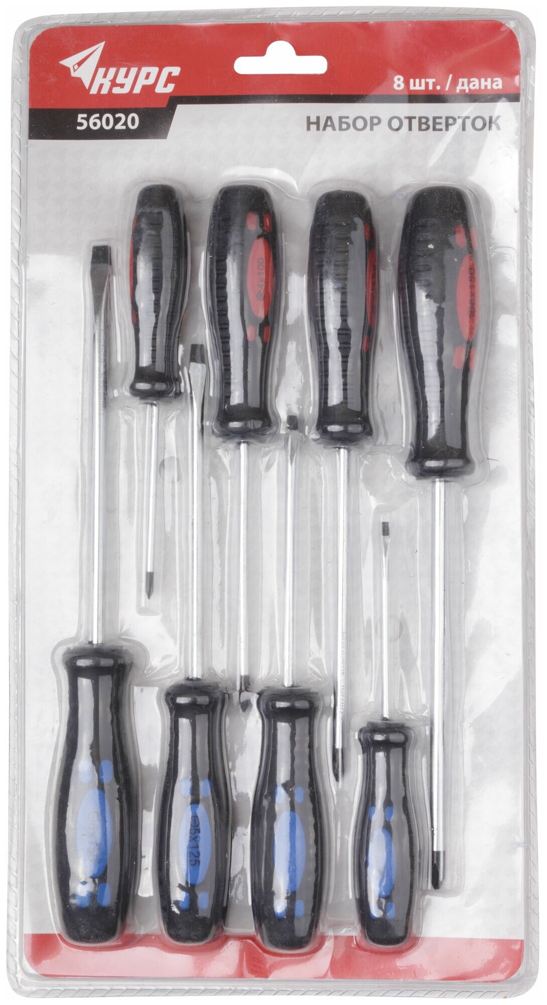 Отвертки Курс Стандарт 56020, CrV сталь, магнитный наконечник, двухцветная прорезиненная ручка, набор 8 шт.