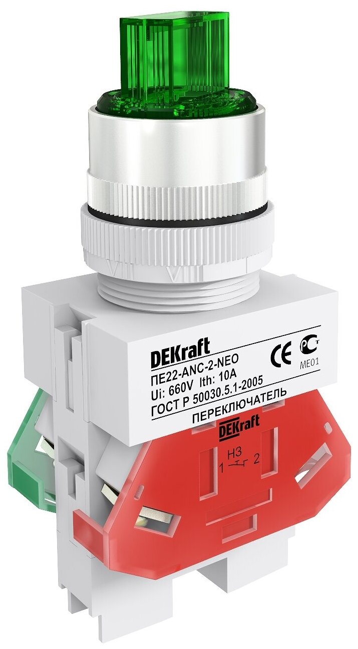 25059DEK ПЕ-22 Переключатель коммутационный 3 фикс. пол. I-O-II 1НО+1НЗ ANC-3 Ø22 мм (индикация зеленый IP54 220В АС) Упаковка (10 шт.) DEKraft