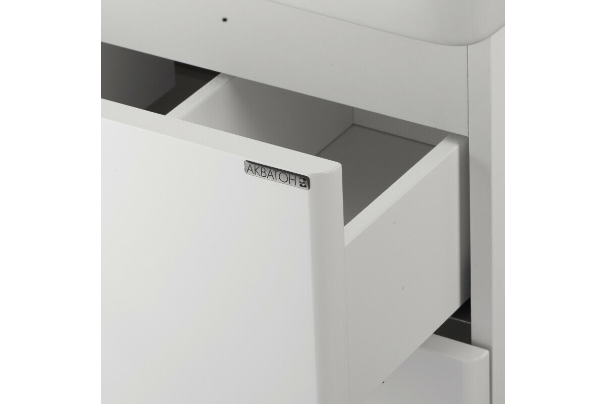 Стильная лаконичная модель, укомплектованная прямоугольной керамической раковиной с широкой удобной чашей. В тумбе имеются два ящика, изготовленные из декоративной влагостойкой ДСП. Нижний ящик тумбы – широкий и вместительный – предназначен для крупных предметов, а в верхнем имеется специальная организация пространства, позволяющая хранить мелкие вещи. Надежные металлические направляющие, рассчитанные на среднюю оптимальную нагрузку 25 кг, устанавливаются на мебельный ящик посредством надвижного монтажа при помощи специальных креплений. Помимо стандартного подключения водоснабжения и канализации из стены предусмотрена возможность подключения снизу – в нижней панели тумбы и за полкой для труб специально оставлено место.