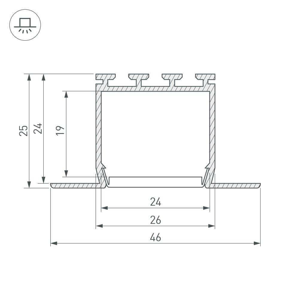 Алюминиевый анодированный профиль для светодиодных лент и линеек. Габаритные размеры (L×W×H): 2000x46,2x24,5 мм. Ширина площадки для ленты 24,2 мм. Экраны, заглушки и другие аксессуары приобретаются отдельно. Цена за 1 метр.
