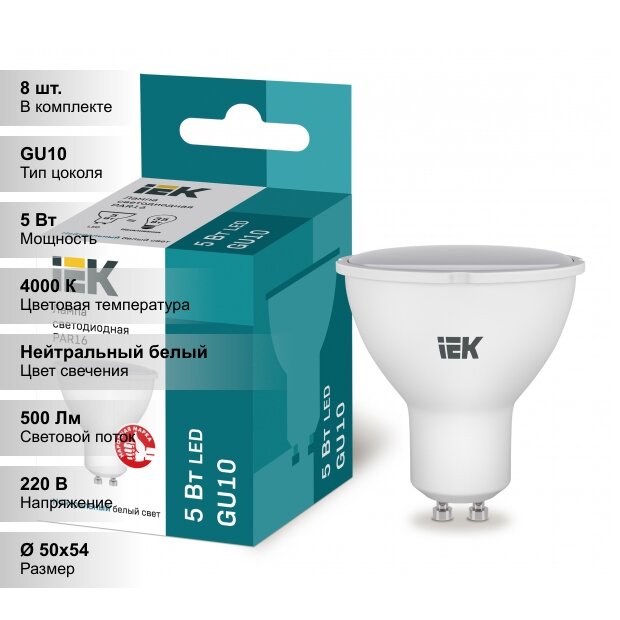 LLE-PAR16-5-230-40-GU10 Лампа светодиодная ECO PAR16 софит 5Вт 450Лм 230В 4000К GU10 Упаковка (10 шт.) IEK
