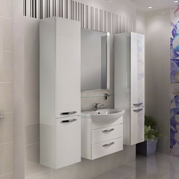 Более вместительный вариант модели с раковиной шириной 65 см. В тумбе уже установлены 2 ящика (верхний - полного выдвижения), а бельевая корзина более объемная, чем в варианте АРИЯ 65.