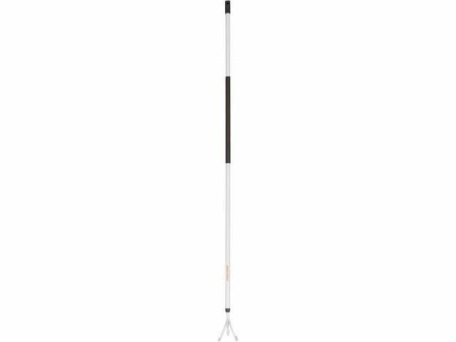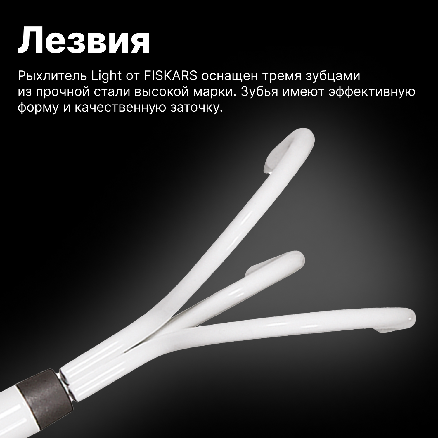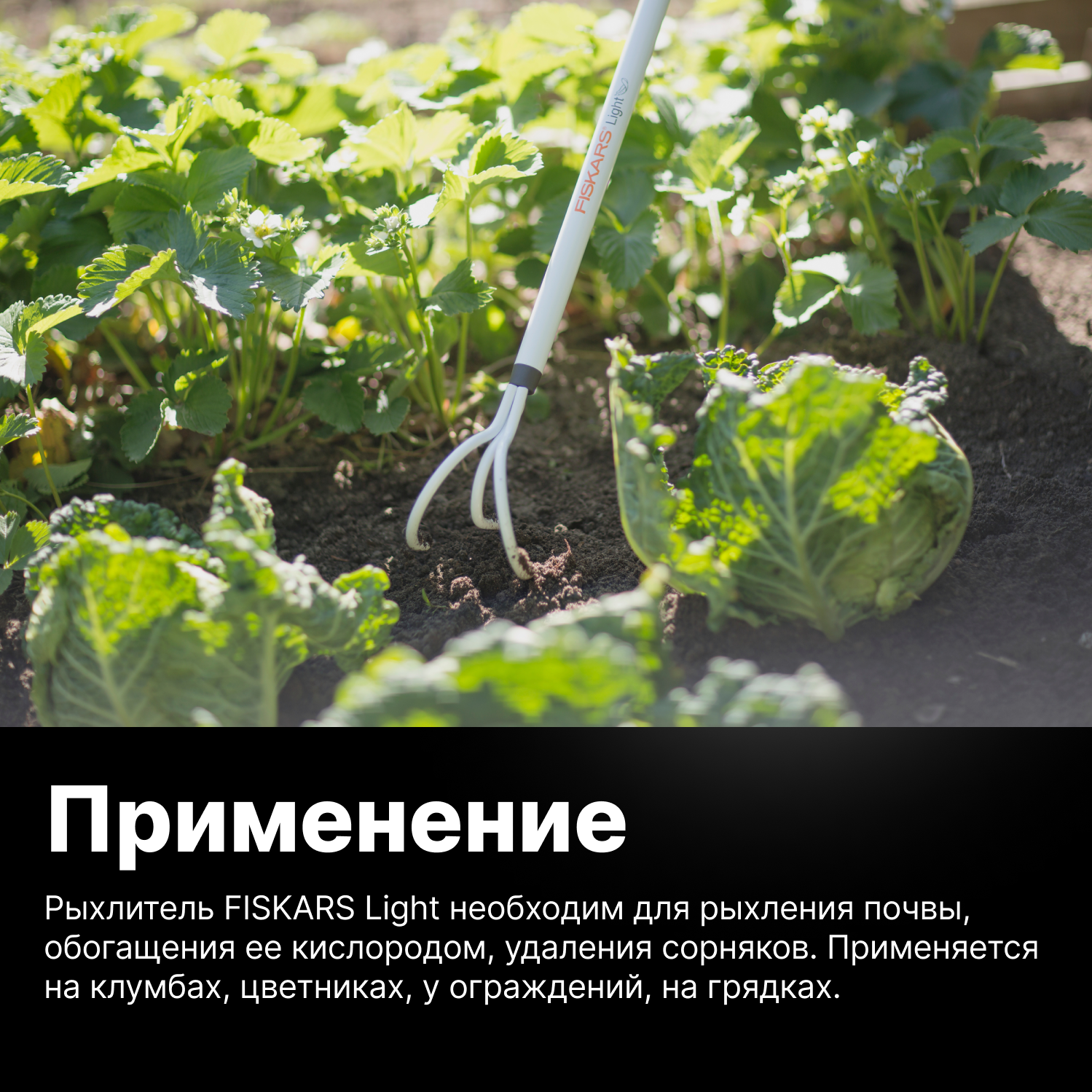Облегченный культиватор Fiskars используется для рыхления почвы под растения. Инструмент состоит из стальной рабочей части и алюминиевого черенка с пластиковым покрытием. Отверстие на конце черенка служит для подвешивания изделия после работы и компактного хранения.