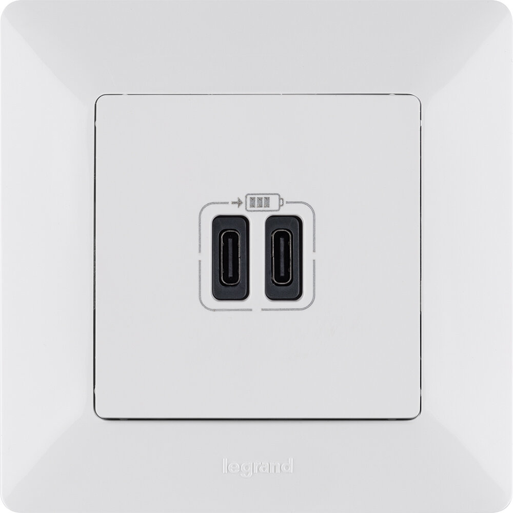 USB-розетка для зарядки и питания различных мобильных устройств. Данная модель имеет два выхода. Включает в себя универсальную модель зарядного устройства с двумя разъёмами типа С. Преимущества USB разъема типа С очевидны: