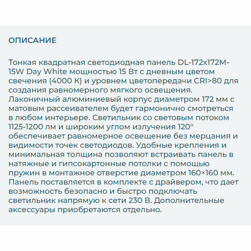 | Дополнительные характеристики | Тонкая панель 15Вт, белый квадратный корпус. Цвет ДНЕВНОЙ БЕЛЫЙ 4000K, св.поток 1125-1200лм, CRI(Ra);80, угол 120°. Размер 172x172x25 мм, установка в отверстие 160x160 мм. Питание AC 110-240V, 15Вт, драйвер в комплекте (DC300mA, 40-50V). |