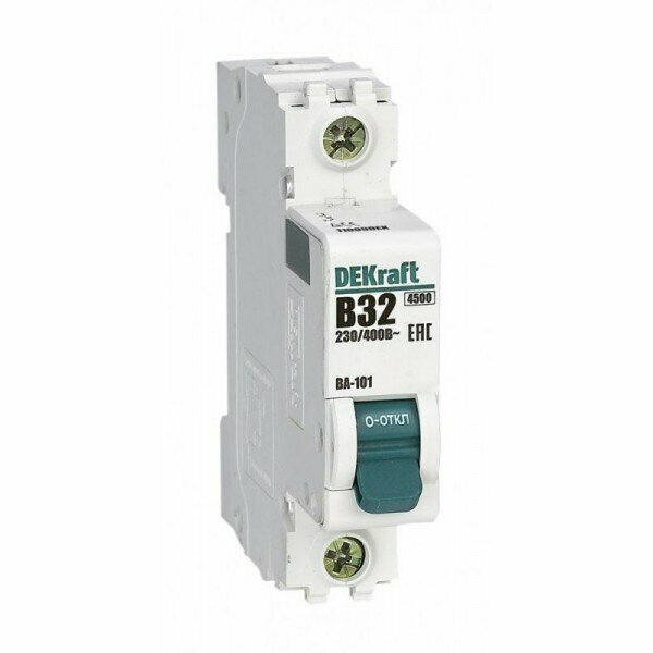 Автоматический выключатель серии ВА-101 DEKraft; 1P; номинальный ток 32 А; характеристика B; отключающая способность 4,5 кА. Новый механизм расцепления мгновенно разрывает цепь при возникновении аварии. 5 монолитных заклепок повышают прочность корпуса аппарата. Сплошная лицевая панель обеспечивает безопасность эксплуатации аппарата. Боковые каналы охлаждения повышают стабильность работы при высоких температурах окружающей среды. Полностью автоматизированный контроль качества производства.