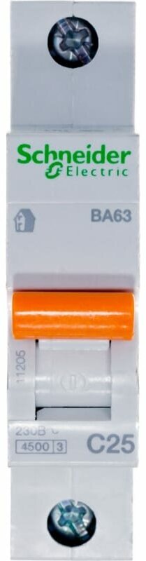 Выключатель автоматический однополюсный Schneider Electric ВА63 типа C, рассчитанный на ток нагрузки 10 А и максимальную силу тока (отключательную способность) 4,5 кА предназначен для отключения питания при увеличении силы тока в сети. Защищает электрическую цепь и приборы от коротких замыканий и токовых перегрузок, тем самым предотвращается выход из строя и возгорание техники.Параметр отключающей способности однополюсного автомата Schneider Electric ВА63 (4,5 кА) означает максимальную силу тока, при которой срабатывает автоматический выключатель. При превышении этого показателя корректная работа автоматики не гарантируется.При выборе защитного автомата по отключающей способности необходимо учитывать максимально возможный ток при коротком замыкании. Обычно, в более старых постройках, используются приборы на 4.5 или 6 кА. Для квартиры в новых домах стоит выбрать защитную автоматику на 10 кА.Обратите внимание: несмотря на похожую единицу измерения и одинаковые числовые значения, номинальный ток и отключающая способность – это разные показатели!Автоматические выключатели типа С обычно используются в быту или на производственных и строительных объектах, для обеспечения изоляции проводников, при монтаже стендов, трансформаторов, двигателей. Устройства размыкают цепь при 5-10 кратном превышении номинальной силы тока.Сделано в Венгрии.